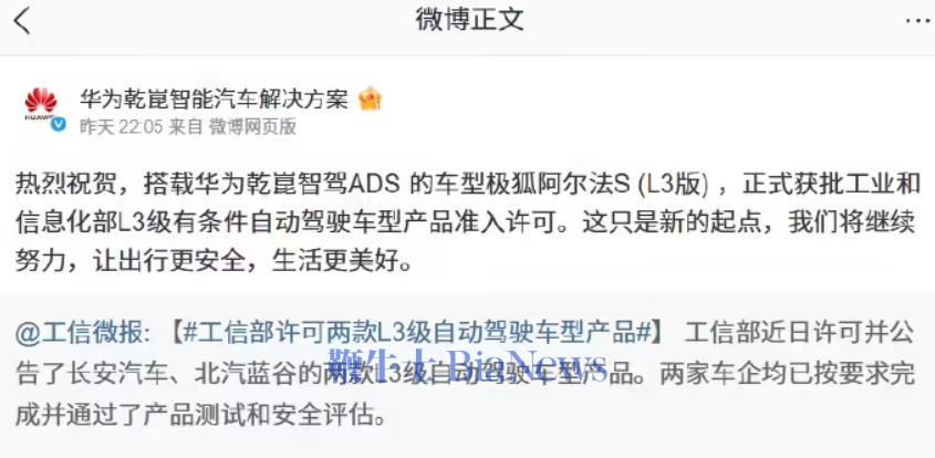昨日,工信部许可长安、极狐两款L3级自动驾驶车型。(转载自:电车界)