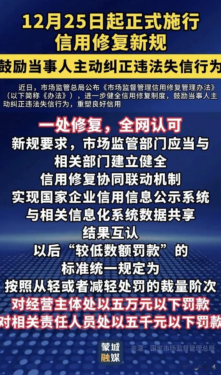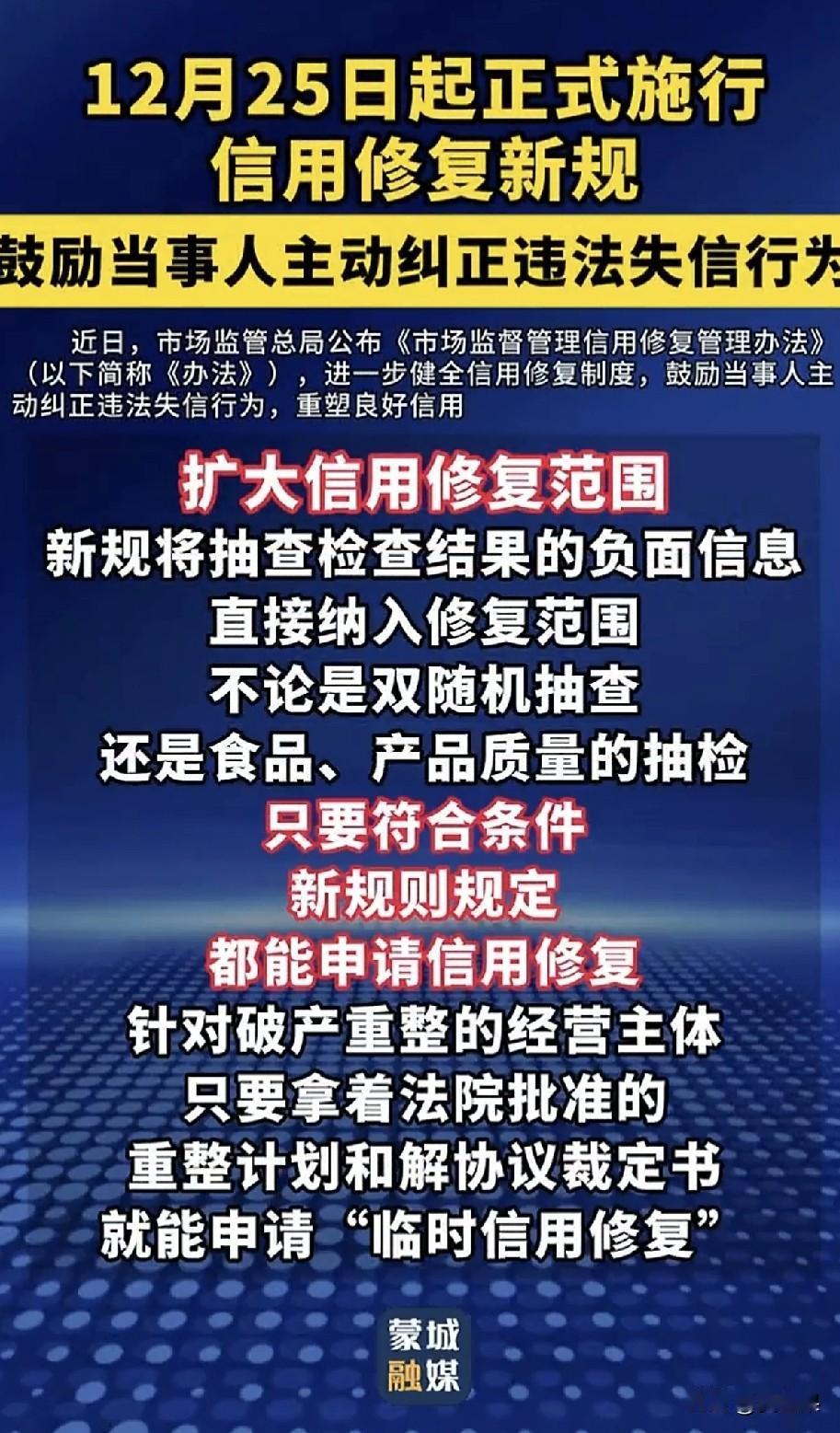 征信可以修复了,从12月25日开始实施, 这对一些失信的企业是个好事, 毕竟上了失信名单对企业发展非常不利。 有些银行和金融机构,因为企业在失信名单,对企业贷款发展经营很不友好。 很多想把企业搞活,想起死回生,可是没有钱,银行不贷给你。 现在却给了机会,只要符合条件可修复征信,可以从失信名单中去掉。 失信企业得到修复后,河南已经有很多企业可以贷款了。 我想老板们会很高兴吧。