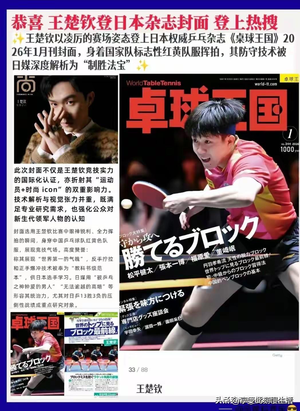 不可思议!在国内被骂逃跑的王楚钦在张本智和香港总决赛夺冠后登上了日本著名的杂志《桌球王国》的2026年1月刊的封面。有点不可置信,按常理应该是他们刚刚夺冠的张本智和登上他们的《卓球王国》杂志才对。 和国外的尊重,赞誉相比,国内的某些人真的是犹如苍蝇和老鼠。不是躲在阴暗的角落就是飞在肮脏的垃圾堆里。 日媒称王楚钦是被乒乓之神钟爱的男人。虽然因背伤退赛。但他还是绅士的,完整的旅行了入场和对手握手,拥抱,致谢裁判等环节。 王楚钦被国内的键盘侠踩来踩去,但是站在球桌另一侧的对手认可他的强大。