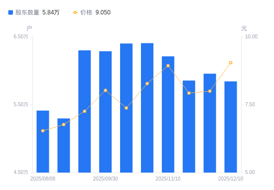 日期A股户数(户)流通A股户均持股数(股)户均持股市值(万元)2025-12-105844412981.2111.752025-11-285957712734.3410.192025-11-205856012955.5010.272025-11-106213512210.0910.922025-10-316408711838.199.802025-10-206401711851.138.752025-09-306288112065.239.692025-09-106301212040.158.742025-08-205297114322.449.702025-08-085414114012.939.16