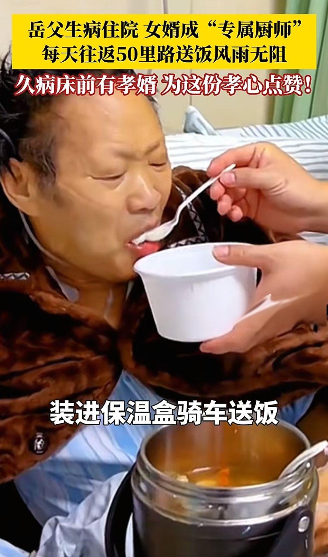 岳父生病住院,女婿化身"专属厨师"每天往返50里路送控糖餐,风雨无阻且顿顿不重样!久病床前有孝婿,为善良孝顺的人点赞。