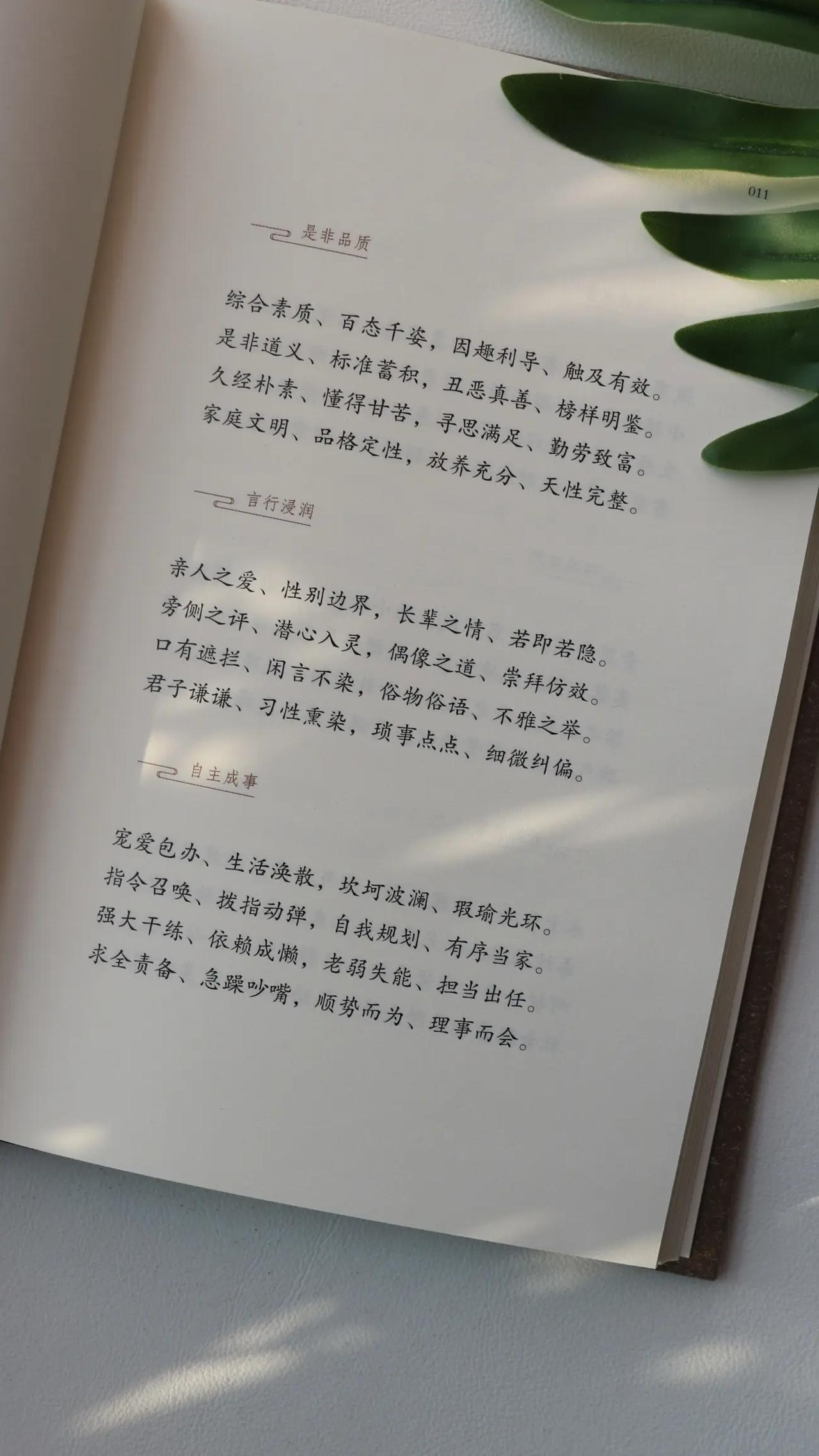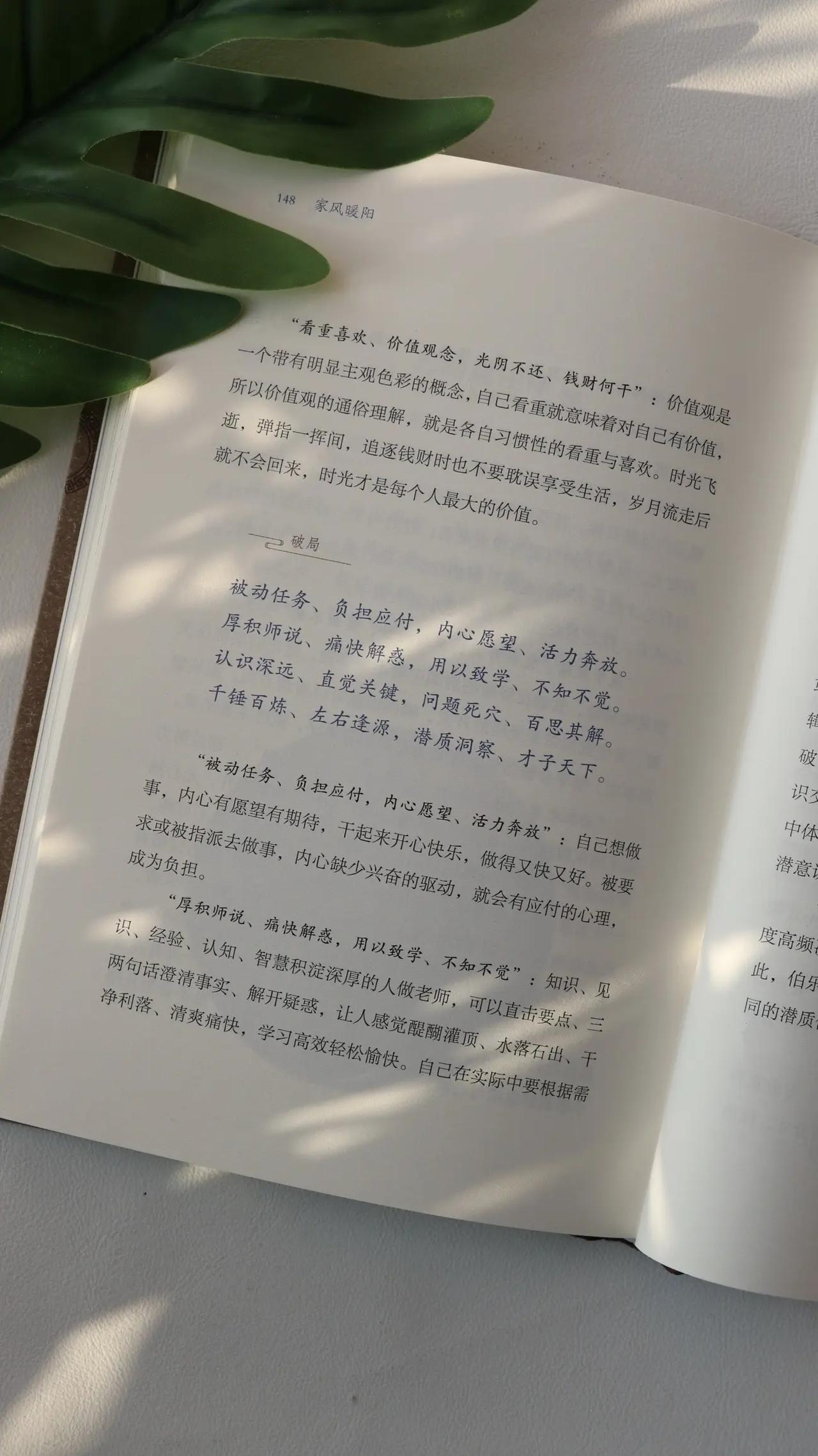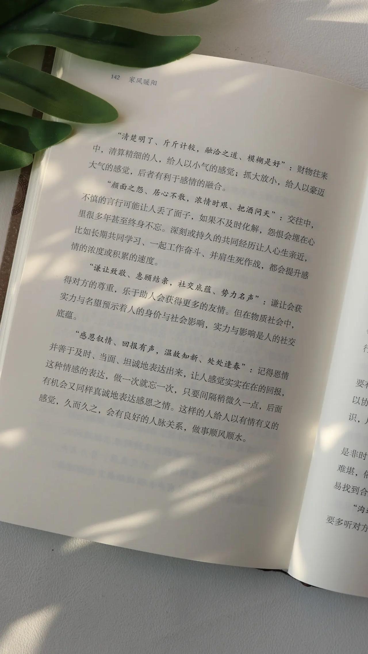 【家风暖阳】:袁名万写的家庭教育实用书,核心是用特别接地气的方式讲家庭教育,还给出了具体的育儿和成长方法。作者没讲空泛的大道理,而是用四字经的形式写内容,读起来朗朗上口,比如教孩子化解矛盾会说“有理饶人、输赢不争”,不管是家长还是孩子都能轻松看懂。书里主要分两大块:1. 认知观念:讲怎么看世界、看人生、看教育,帮家长先摆正教育的核心思路;2. 目标方法:从父母该怎么做、孩子成长、学习、婚恋、职场等方面,给出具体的引导方向。作者还结合自己养孩子、做企业管理的经验,提出了“8—50要素体系”,把人的素质分成人格、技能等8大类,细化成50多个指标,让家长能清晰看到孩子该培养的能力。整本书就像一本家庭教育的小手册,内容简短但实用。家风暖阳 读书 好书分享 人生领悟道理