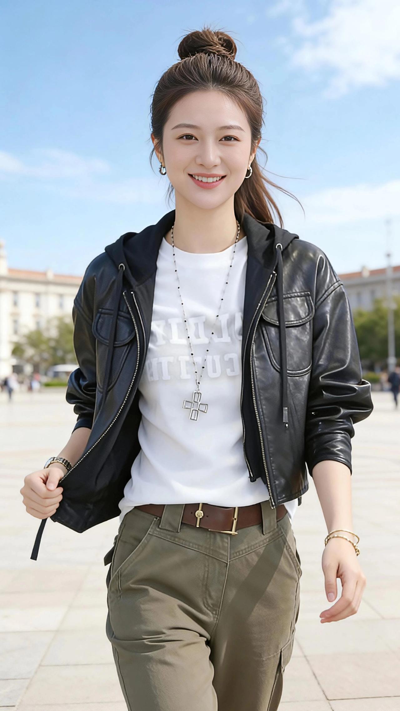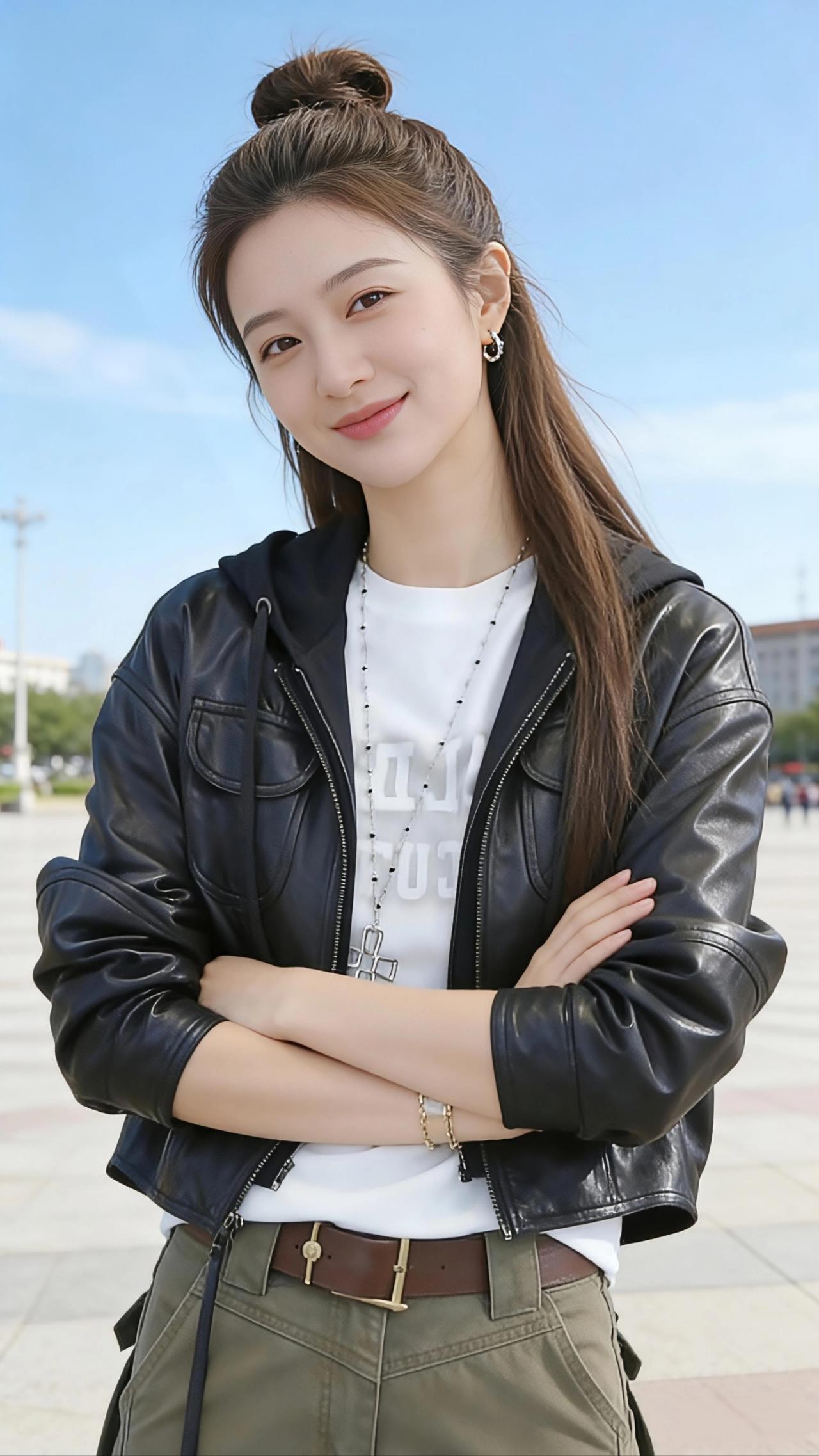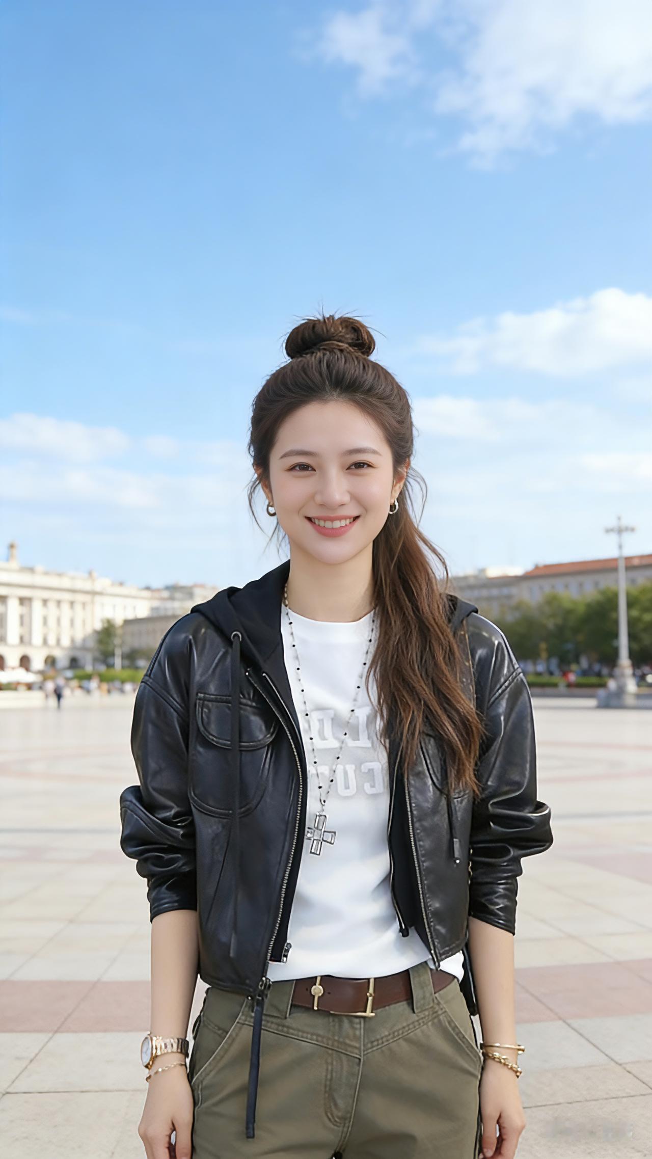 风里的率性 晴空把蓝调得透亮,云絮轻悠悠地飘在天际,广场的石板路被日光晒得温温的,风掠过的时候,带着几分爽朗的气息。 她站在这片开阔里,黑皮衣的哑光质感揉着白T恤的干净,军绿色工装裤的线条利落,像把街头的随性和都市的飒气揉在了一起。半扎的丸子头松松挽着,几缕长发随微风晃荡,腕间的细链、颈间的十字坠,是不经意的点缀,却让这份率性多了点温柔的细节。 双臂交叠时,是藏不住的自信;展臂舒展时,又像要拥住整片蓝天。脚步轻踏石板的瞬间,衣摆被风掀起一角,皮革的纹路摩挲着空气,她笑着往前走,发丝拂过脸颊,眼里盛着的,是和晴空一样明朗的光。 风还在吹,把这一身利落的穿搭,酿成了城市里最鲜活的风景,无关刻意的雕琢,只是随心而行的自在,就足够动人。 高级感穿搭 皮夹克 穿出你的时尚你的感觉 时尚穿搭