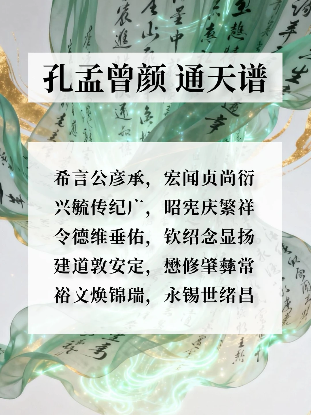 通天谱特指孔、孟、颜、曾四姓共用的字辈谱(孔丘、孟轲、曾参、颜回四大圣贤),因这四姓被认为是儒家圣人后裔,字辈由皇帝钦定、天下统一,故称“通天谱”,体现“天下一系”的儒家传承理念。(图片2️⃣)