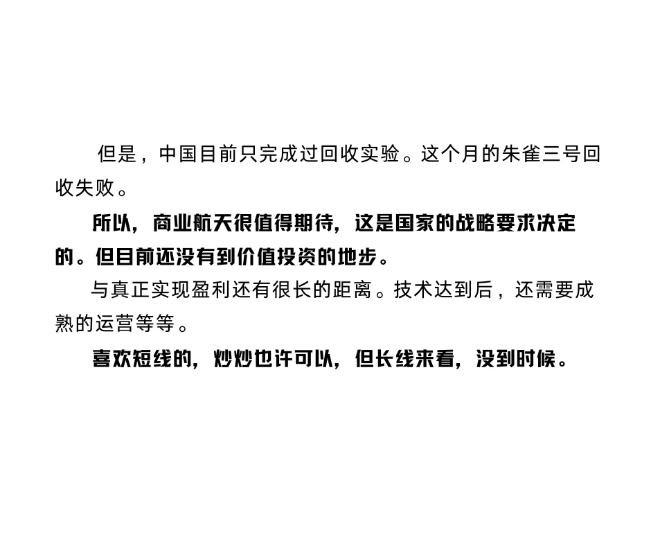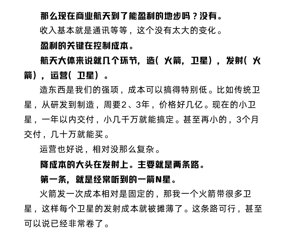 财经知识 股市 商业航天 理财 航空航天 商业航天这两周很火,航天局专门成立了商业航天司,也发布了专项规划。 那么商业航天到底怎么样,值得买吗? 直接说观点,短期投机情绪很重。个人不会买,长期来看商业航天的拐点还没来。 首先解释一下商业航天是什么,靠什么挣钱。 商业航天,就是发射火箭把卫星送到太空。 靠什么挣钱呢?主要的方式就一个——通讯。 比如目前世界上几乎唯一挣钱的商业航天企业,马斯克的SpaceX,主要就是卖星链提供的互联通讯服务。 这件事就很有意思了,我们现在几乎没有商业航天,但是通讯都很畅通,为啥还要航天再提供一样的服务呢? 这是使用范围的问题。航天是在很特殊的情况下用的。 日常通讯主要是通过地面基站。在国内基本上各个地方都有覆盖,平时使用完全没有问题。 但是,地球上能够用基站覆盖的面积不足10%,我们不太能够跑到冰川,沙漠,海里去建基站。 更不能跑到别的国家去建基站。 平时是无所谓,但是到特殊时间就很麻烦了。比如俄乌期间,乌克兰用的就是马斯克的星链提供的实时通讯和数据。 所以各个国家就需要构建自己的卫星系统。而这一类的卫星主要集中在离地球2000千米以下的低轨道,总共就那么大点地方。谁先占了就算谁的。 中国目前圈地盘的情况怎么样呢?距离很大。美国,10000多颗。中国,300多颗。 在资本市场上,短期炒概念。长期看业绩,换句话讲,就是要能盈利。 到了能盈利的地步吗?没有。 盈利的关键就在控制成本。 航天大体来说就几个环节,造(火箭,卫星),发射(火箭),运营(卫星)。 造东西是我们的强项,成本可以搞得特别低。 运营也好说,没那么复杂。 降成本的大头在发射。主要就是两条路。 第一条,一箭N星。 发一次成本相对固定,那我一个火箭带很多卫星,这样每个卫星的发射成本就被摊薄了。 美国,2021年SpaceX的猎鹰九号,一箭143星;印度也很猛,2017年,一箭104星;我们也不错,2023年长征二号丁,一箭41星。 一箭N星可以节约成本,但是其实有限。带的越多,火箭也要越重,精度也受影响,这也增加了成本。 第二条,最重要的方向,可回收火箭。 SpaceX 猎鹰 9 号,一级火箭回收,单次发射成本降幅能达 72%。 这一方面,美国大幅领先。猎鹰9号回收已经达到546次。 但是,中国目前只完成过实验。朱雀三号回收失败。 所以,商业航天很值得期待,这是国家的战略。但还没有到价值投资的地步。短线炒炒也许可以。