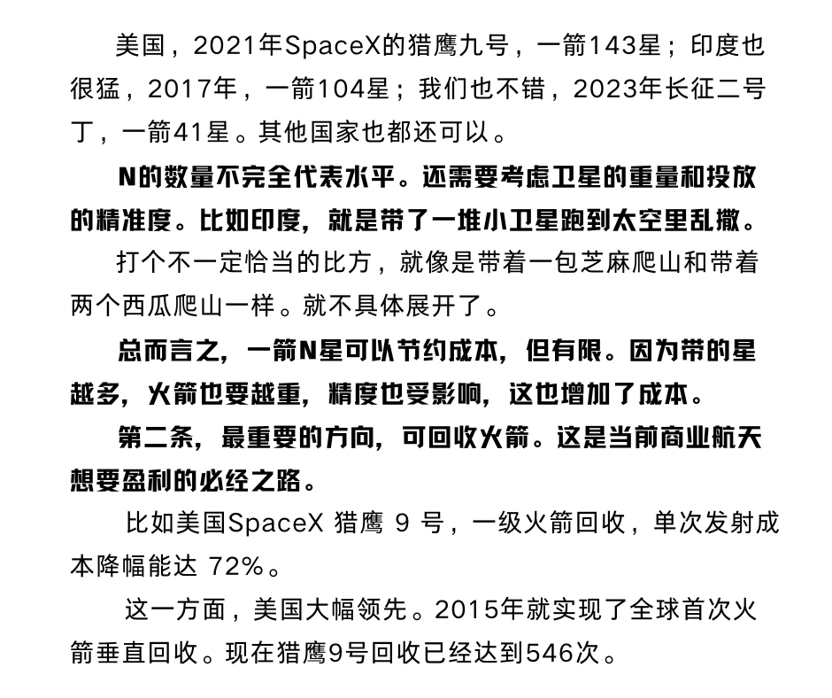 美国,2021年SpaceX的猎鹰九号,一箭143星;印度也很猛,2017年,一箭104星;我们也不错,2023年长征二号丁,一箭41星。