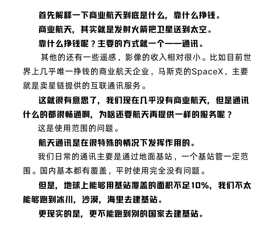 比如目前世界上几乎唯一挣钱的商业航天企业,马斯克的SpaceX,主要就是卖星链提供的互联通讯服务。
