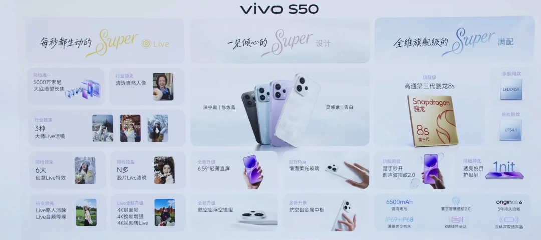 👉vivo S50:vivo这次采用的是5000万索尼超防抖大底主摄和5000万索尼大底潜望长焦镜头,支持全像素双核对焦,压根不需要什么技巧,随手拍就是氛围感大片!还有主摄级长焦Live,X系列同款的索尼IMX882 传感器,1/1.95 英⼨的规格,这配置直接拉满了好嘛!