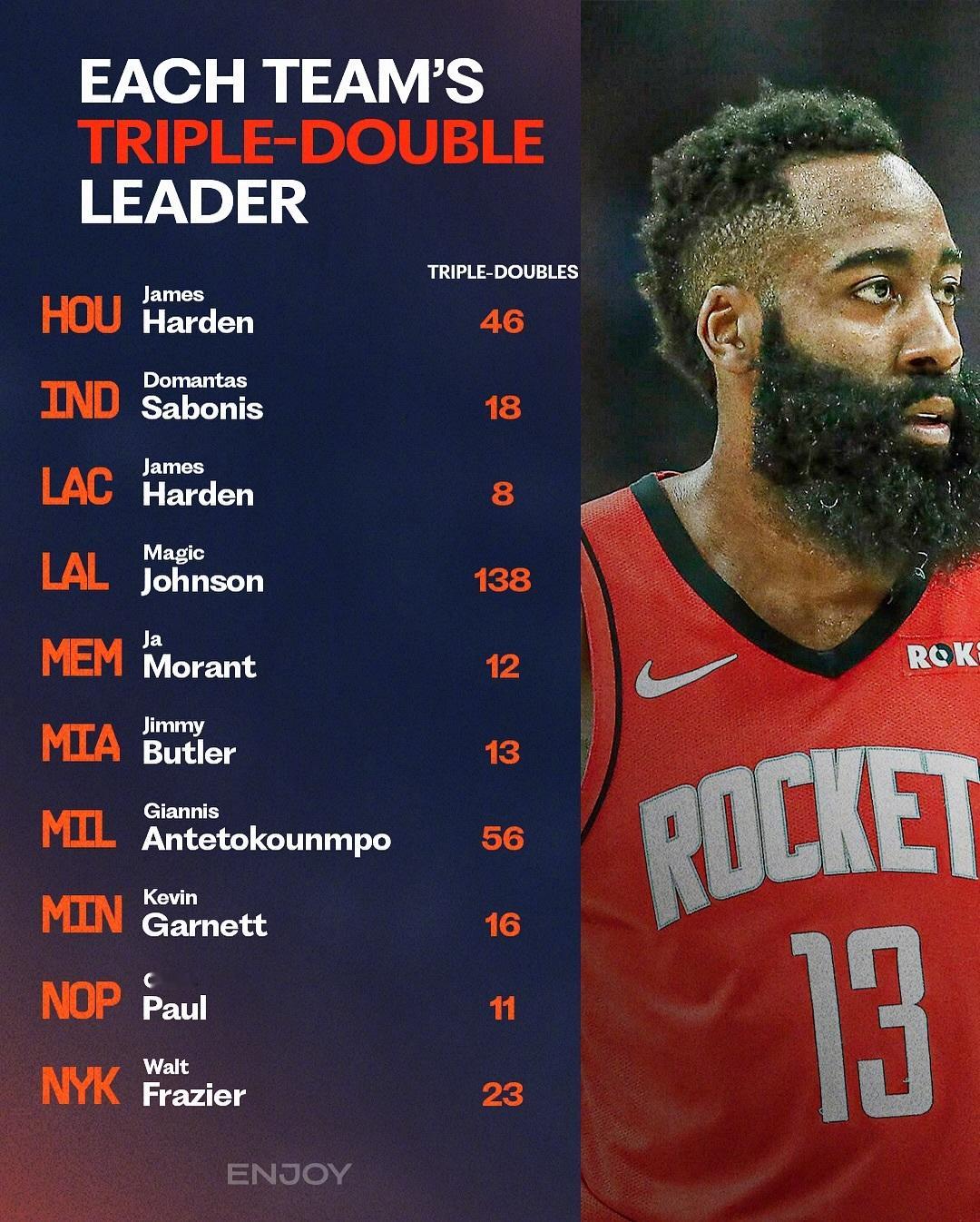 各队队史三双王,富裕家庭有100多次的,三双少的队史第一才个位数。