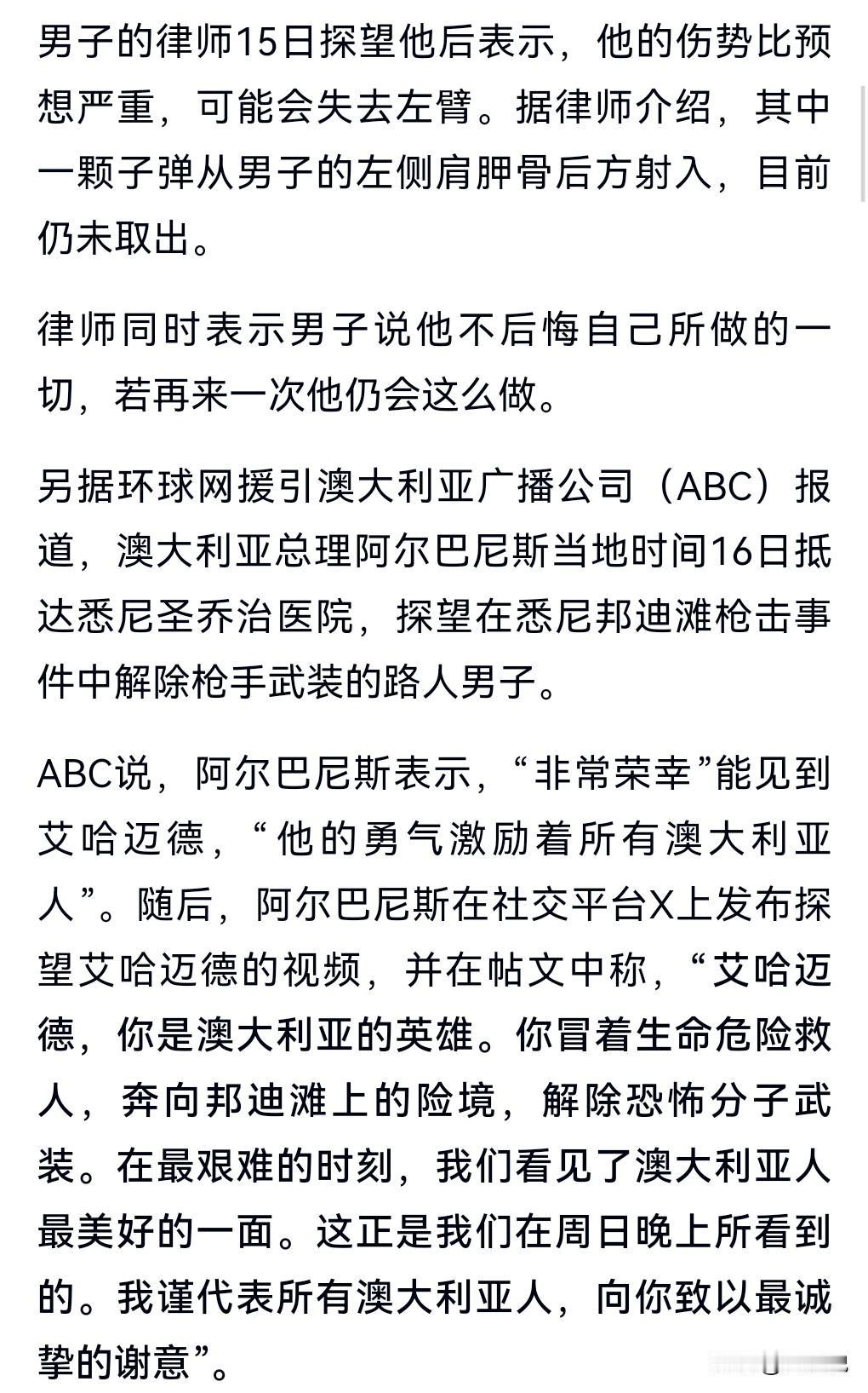 这真的是太伟大了。 真的非常的勇敢。 近日悉尼有两名枪手进行恐怖行开枪行为。 有一位英勇的白衣男子从犯罪分子手中夺枪。 他行动之前曾留下遗言。 他对亲戚说:我可能会死,但告诉我家人,我为救人而倒下。 这真的是让人动容,这真的是不顾生命危险的去救人。 这个人称得上伟大。 此人中了两枪,律师称可能失去左臂。