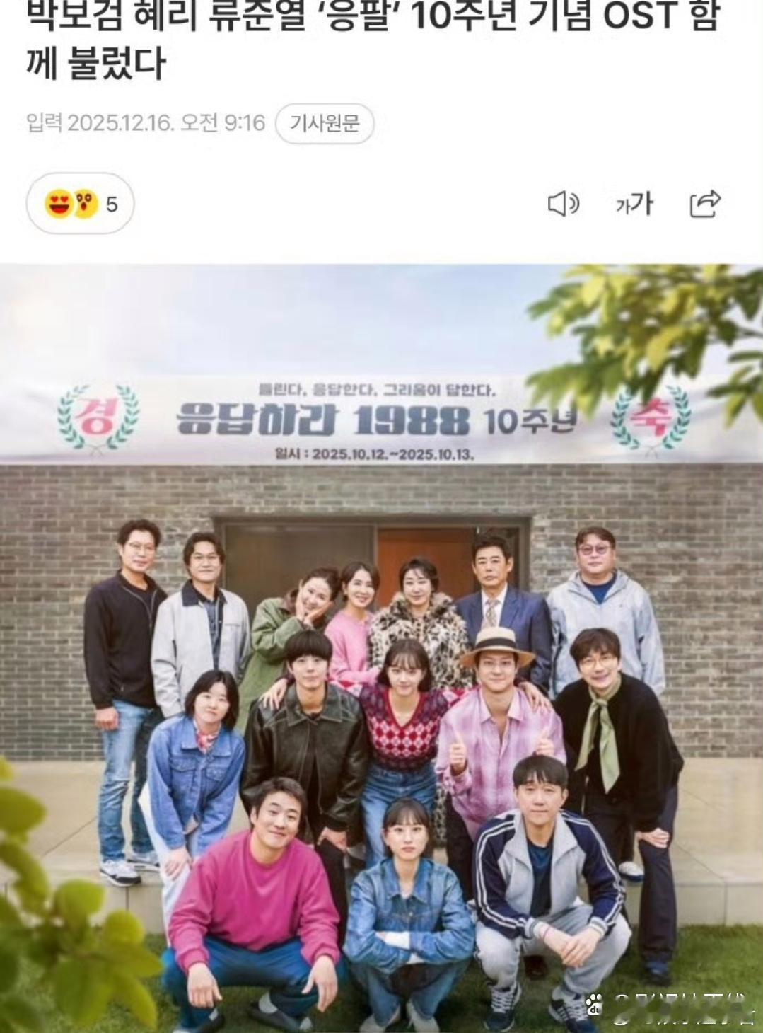 据韩媒,《请回答1988》将发布十周年纪念OST。第一部分为由朴宝剑演唱的单曲,将于19日公开;第二部分有两首歌将于26日公开,第一首由双门洞妈妈们李一花、罗美兰、金善映演唱,第二首则由双门洞孩子们柳慧英、李惠利、高庚杓、柳俊烈、朴宝剑、安宰弘、李东辉、崔胜元演唱。李惠利、柳俊烈这是要合作新歌了?