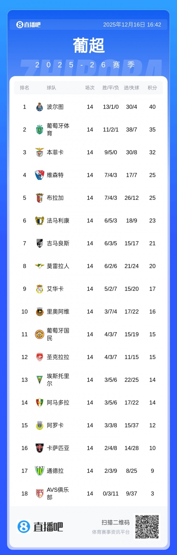 直播吧12月16日讯上周末葡超进行了第14轮的争夺,积分榜前三波尔图、葡萄牙体育和本菲卡均取得胜利,保持着在积分榜上的位置。