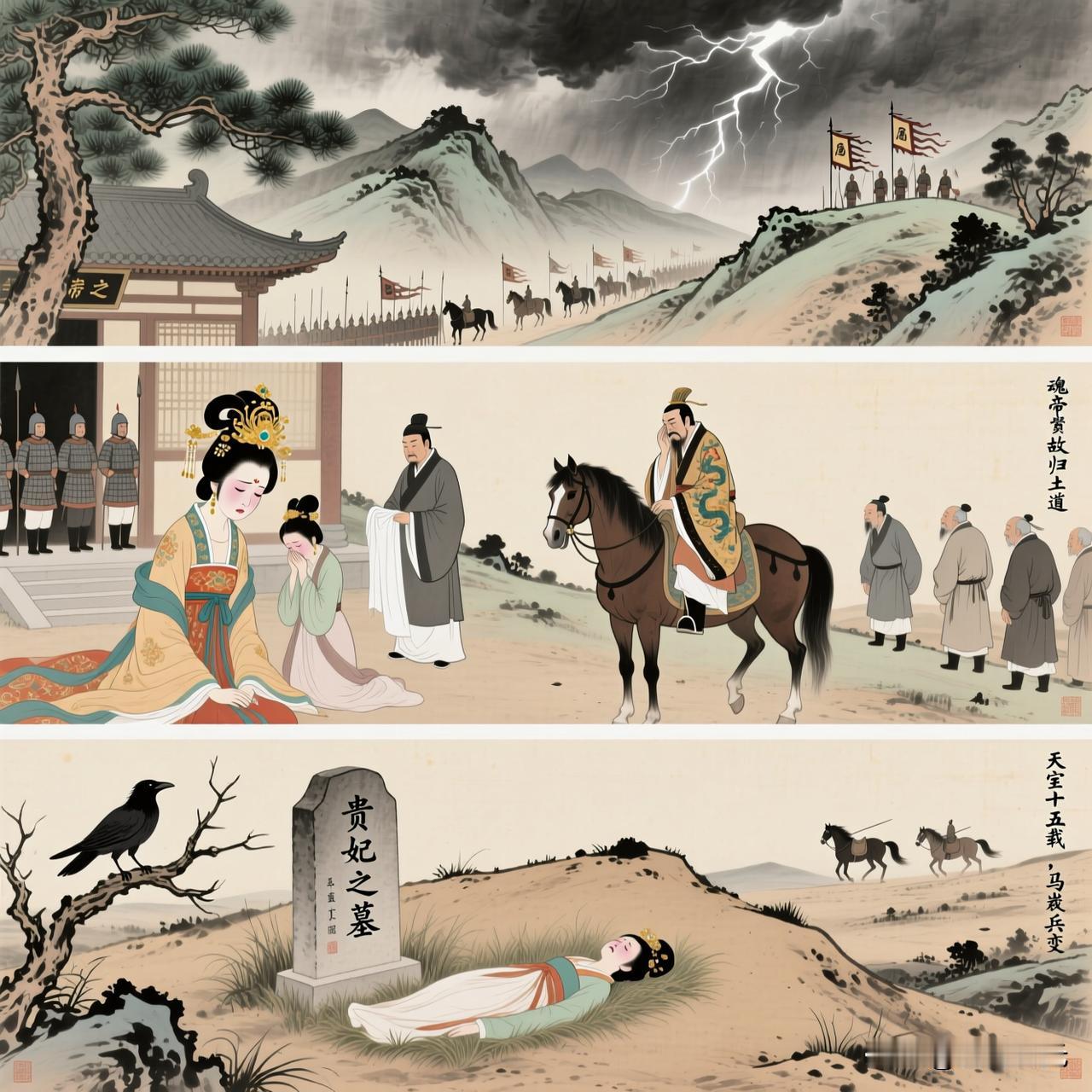 735年7月,唐玄宗李隆基女儿咸宜公主在洛阳大婚,杨玉环应邀参加。咸宜公主胞弟寿王李瑁对杨玉环一见钟情,在李瑁生母武惠妃参和下,李隆基当年就下诏册封杨玉环为寿王妃。 寿王李瑁在迎娶杨玉环归来之时,当队伍走到今陕西兴平市西北二十三里马嵬坡(也叫马嵬驿)的时候,杨玉环跳下马车,走过一架小桥,推开一间佛寺大门,看见了大殿上的佛像,她正待上前,旁边的木鱼声将她的眼睛吸引了过去,原来边上有一禅师在打坐念佛,玉环嬉笑着过去,那禅师缓缓睁开双眼,对着玉环问道:施主,你从哪里来?到哪里去呀?杨玉环说,你猜?老禅师说,人生的起点即是归宿!谁能逃脱生死轮回之苦啊?杨玉环说,怎么?人还有生死轮回?老禅师回了一声,然也。杨玉环听到这话似懂非懂,她环伺了大殿一周,此时,外边传来喊声,催她上车开拔。杨玉环说,多谢师傅指教,小女要告辞了,说着一步三回首嬉笑着离开了。老禅师看着杨玉环离去的背影,哀叹了一声,“我们还会在这里见面的”说完,老禅师闭上了眼睛,双手合十,念起经来。 二十年后,时间来到755年,安禄山以"清君侧"为名发动叛乱,攻破潼关后,唐玄宗李隆基于756年6月仓皇出逃。7月15日,人马行至马嵬驿时,士兵以"杨国忠(杨玉环堂兄)勾结吐蕃谋反"为由将其斩杀,并波及杨国忠之子及杨贵妃姐妹。随后,护国将军陈玄礼以"将士安则陛下安"为由,逼唐玄宗赐死杨贵妃,高力士在马嵬驿佛寺里用白绸缢死杨玉环后,士兵情绪才平息。 这也正应了老禅师“我们还会在这里见面的”那句话,“天道好轮回,苍天饶过谁”!