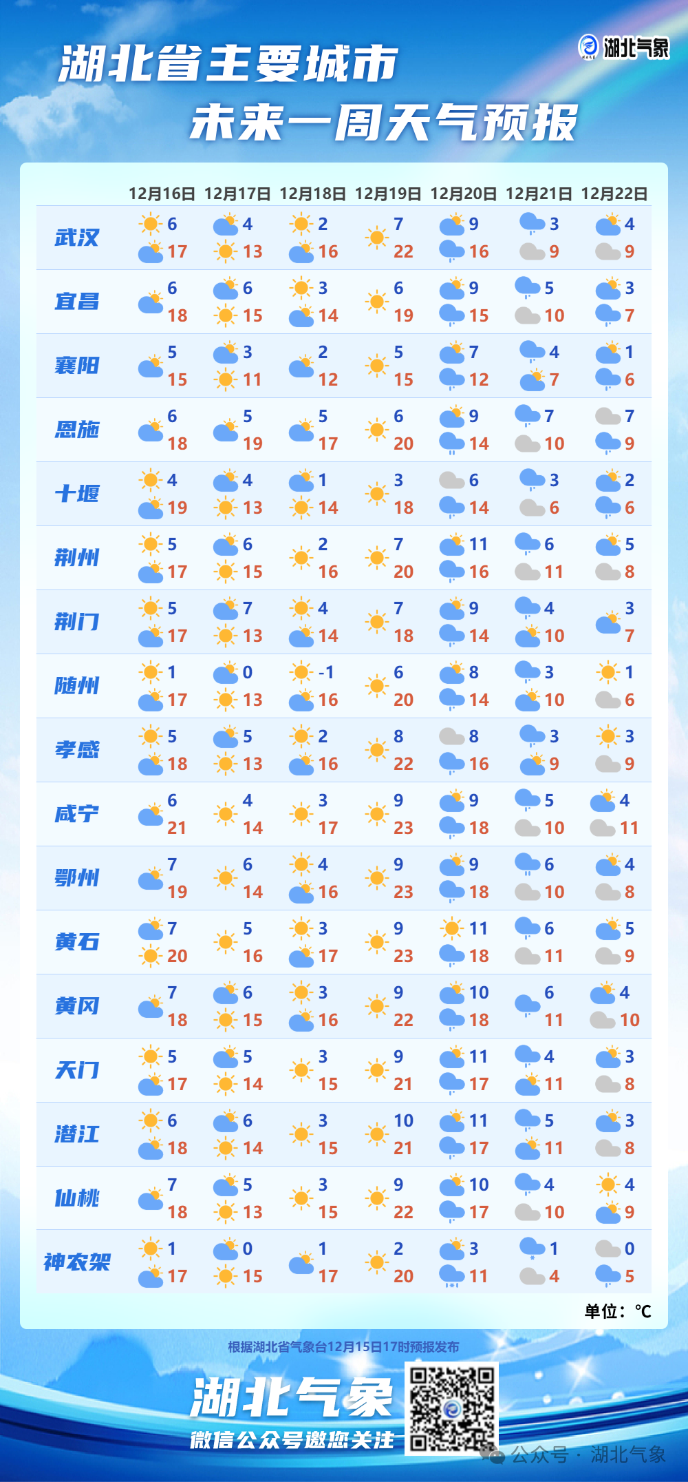 昨日(15日)07时至今日07时,湖北省多云到晴天,最高气温较前一天有小幅回升,大部为13~18℃。今晨最低气温北部0~4℃、南部4~9℃,竹溪最低-0.5℃。