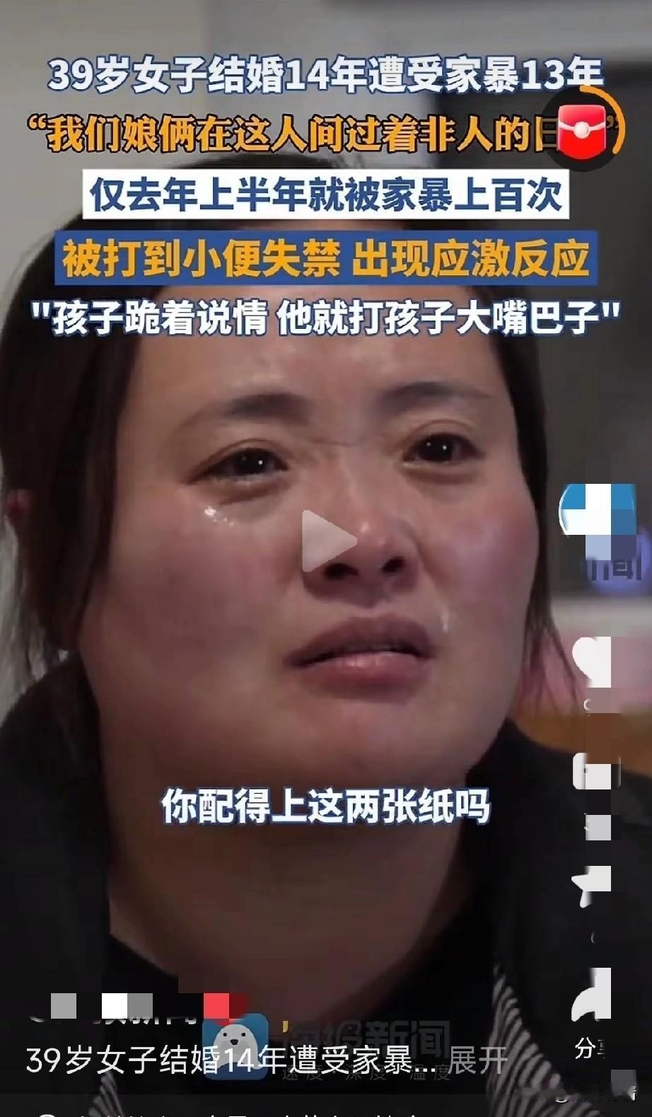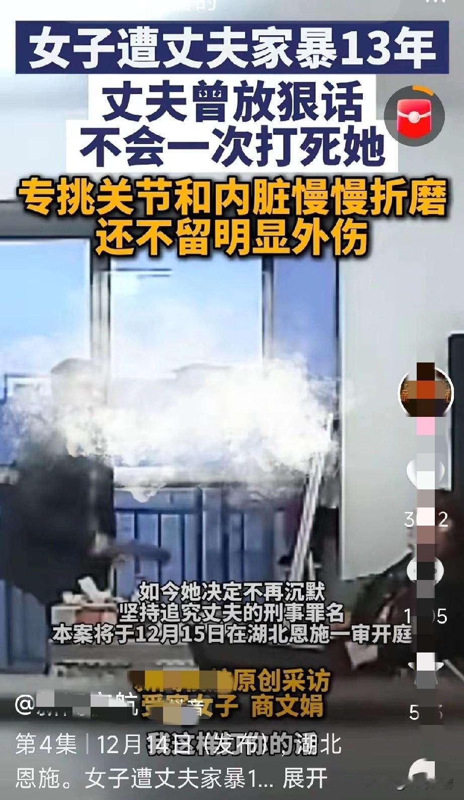 湖北恩施女子遭丈夫家暴13年, 丈夫专挑关节和内脏,慢慢折磨, 不留明显外伤, 这是多大的仇多大的怨, 他的孩子曾跪着说情, 丈夫连孩子也打, 她报警超过20次, 还申请过人身保护令, 但是都没什么用, 每次都陷入了报警调节再施暴的循环当中,仅去年上半年就被家暴过上百次, 面对记者的询问, 她是一把鼻涕一把泪, 一定要追责丈夫的刑事罪名, 就是不透露丈夫打她的原因, 如今她的亲戚都劝她离婚, 不知道她为何还坚持? 家暴持续了13年, 不知道她为何要忍受这么久? 如果自己没有错, 还不如直接离婚了事, 家暴是不可取的, 该女子的老公也是狠人, 就是天大的事13年也该结束了, 大家对于家庭中的家暴怎么看? 婚姻与家庭 家暴 家暴致死 家暴违法行为 家暴妻女 家暴女人离婚 家暴新规 婚前家暴