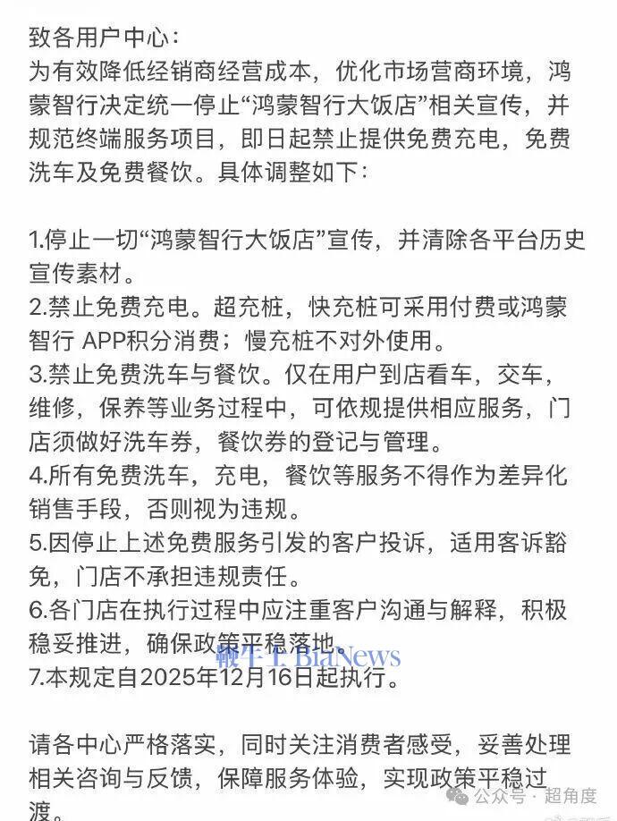 今日一则网传通知显示,为有效降低经销商经营成本,优化市场营商环境,鸿蒙智行决定统一停止“鸿蒙智行大饭店”相关宣传,并规范终端服务项目,即日起禁止提供免费充电,免费洗车及免费餐饮。