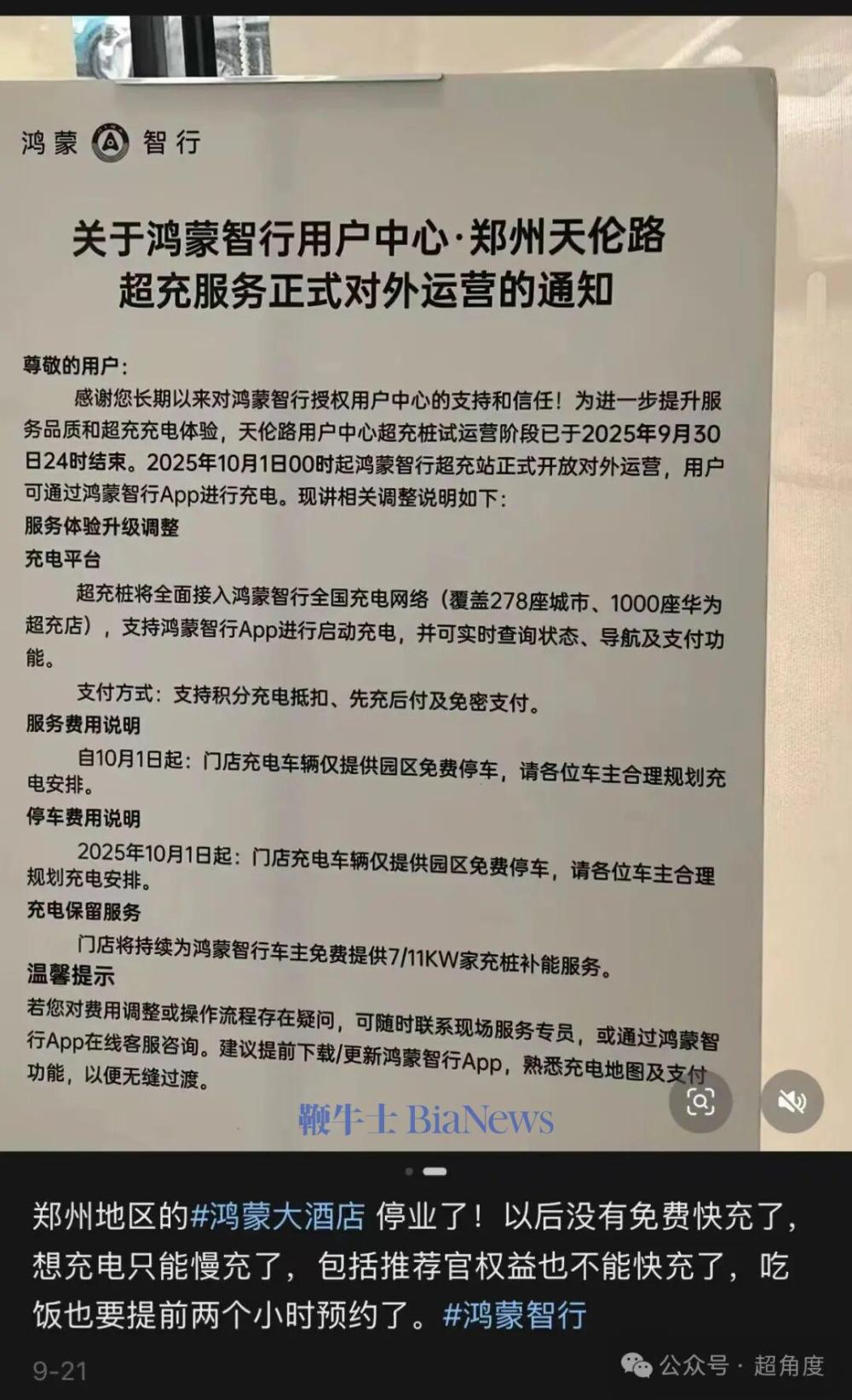 今年9月份,也有网友发文称,郑州地区的鸿蒙大酒店“停业”了,没有免费快充了,吃饭也要提前两个小时预约了。
