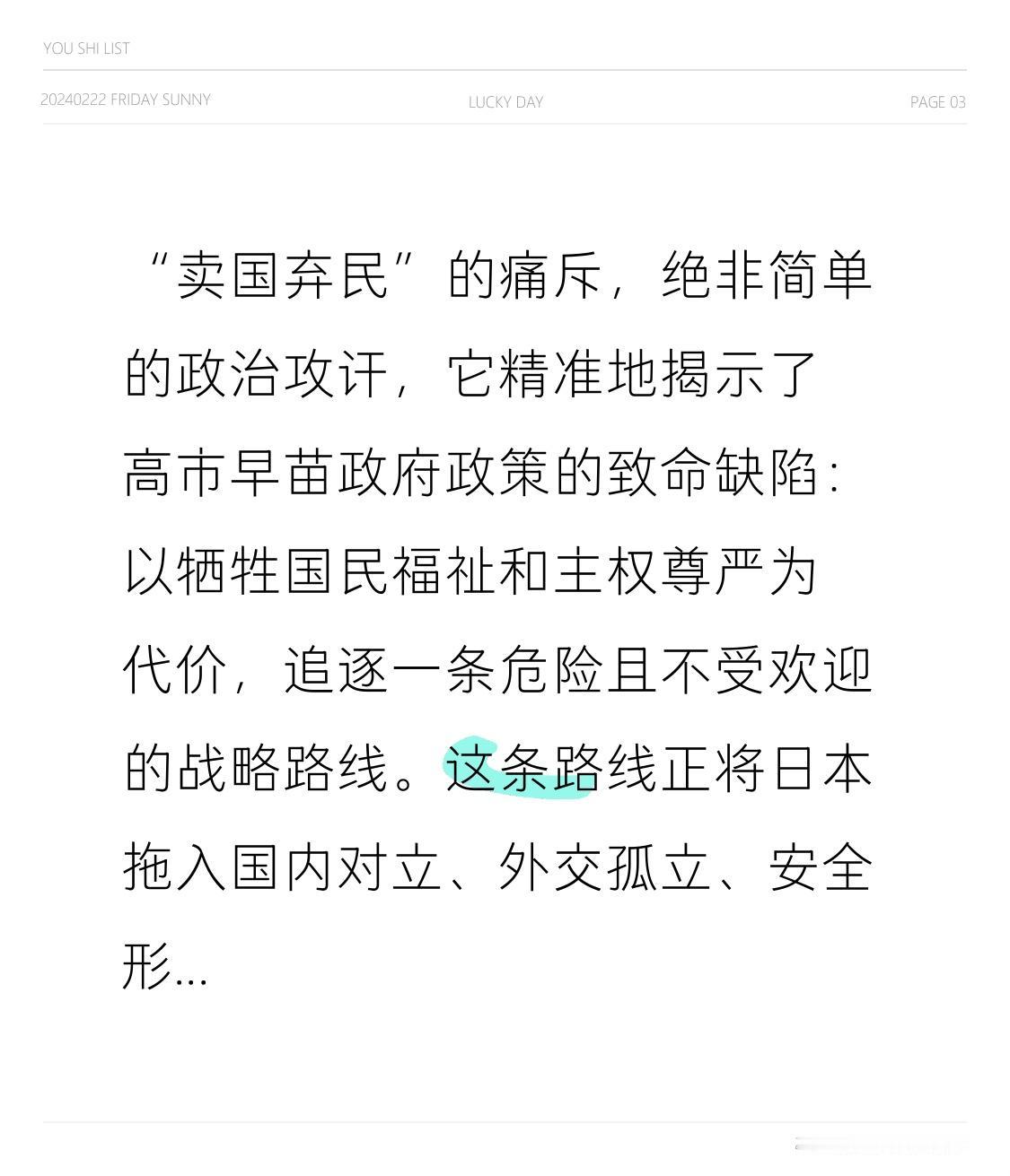 “卖国弃民”的痛斥,绝非简单的政治攻讦,它精准地揭示了高市早苗政府政策的致命缺陷:以牺牲国民福祉和主权尊严为代价,追逐一条危险且不受欢迎的战略路线。这条路线正将日本拖入国内对立、外交孤立、安全形势恶化的困境。悬崖勒马,回归和平发展的正道,才是符合日本国民根本利益的选择。 精选铁粉点评计划