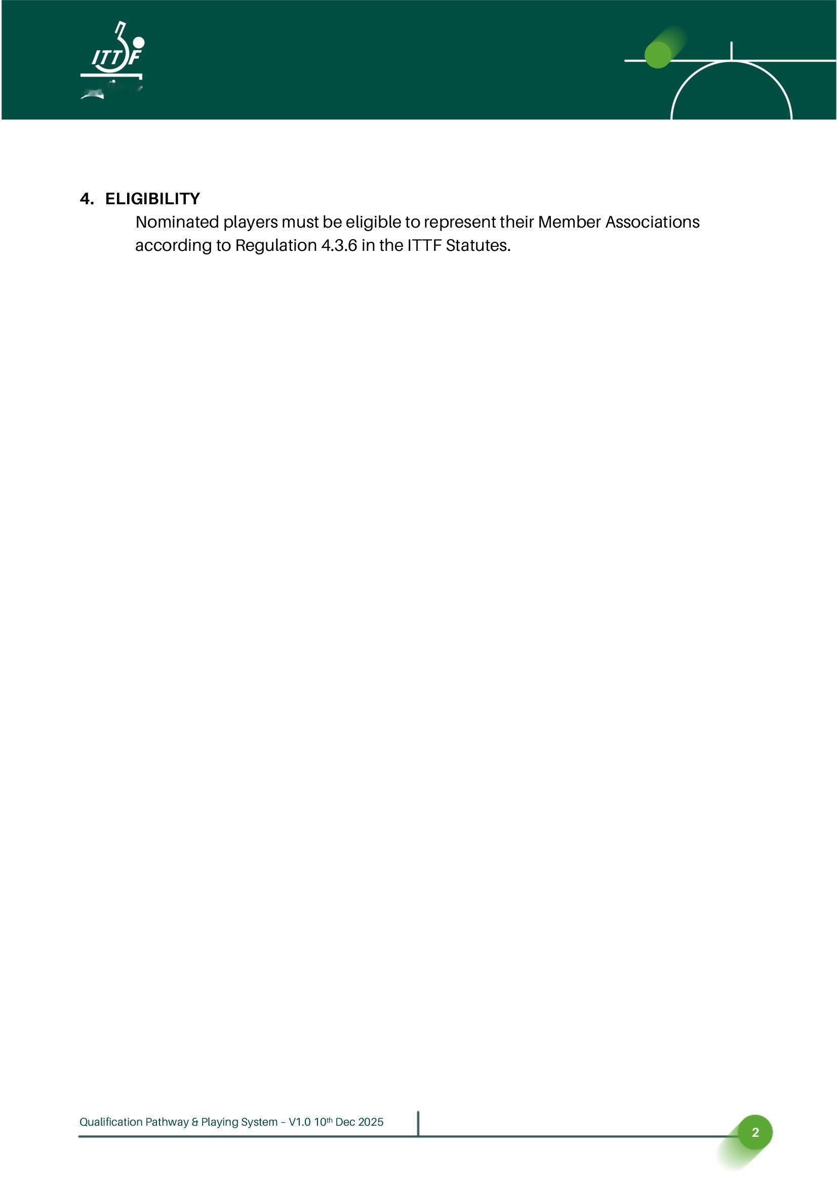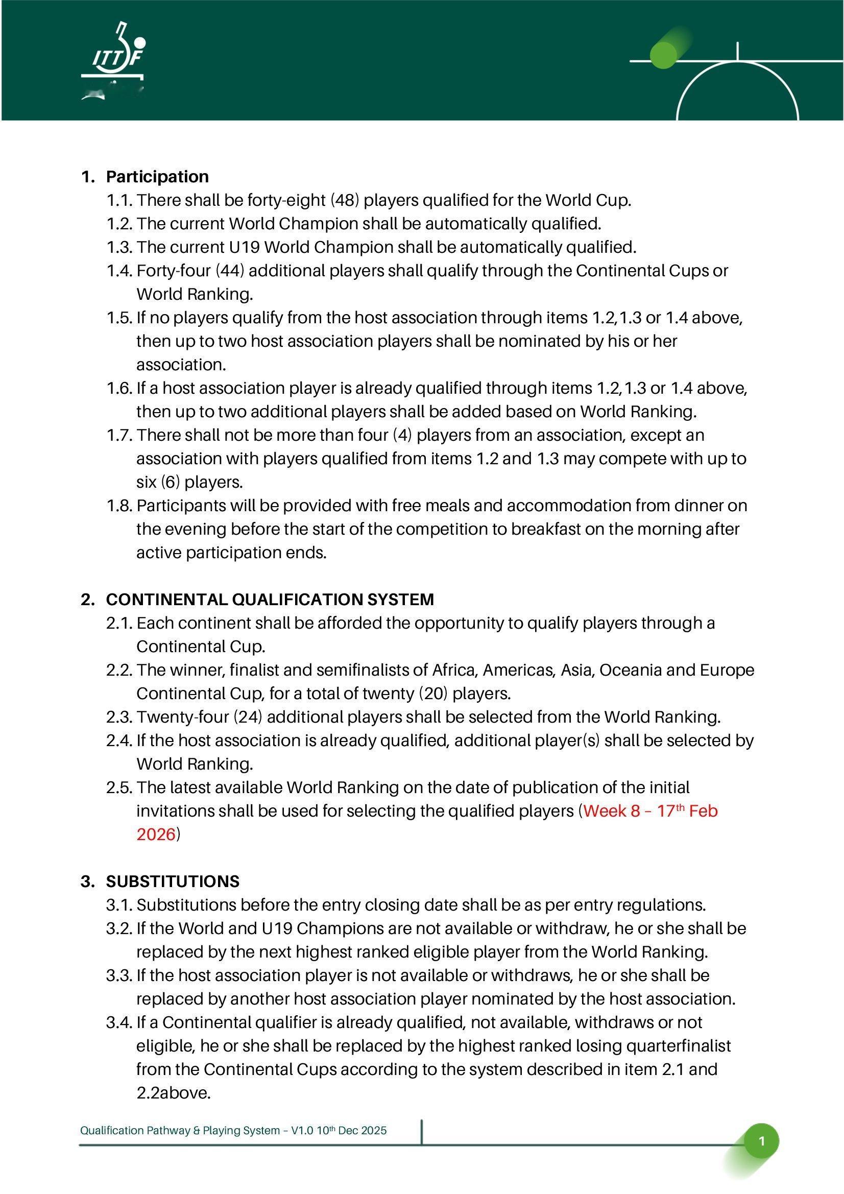 2026澳门国际乒联单打世界杯丨资格获取体系【参赛资格】男女单各有48名球员获得参赛资格1.最新世锦赛单打冠军自动获得参赛资格2.最新世青赛U19单打冠军自动获得参赛资格3. 另有44名球员可通过洲际杯赛或世界排名获得参赛资格4.如果东道主协会没有球员通过上述途经获得参赛资格,则该协会最多可提名2名协会球员5.如果东道主协会已有球员通过上述途经获得满额参赛资格,则最多可根据世界排名增加2名球员6.每个协会参赛选手不得超过4名,但根据第1、2条获得参赛资格的协会最多可派出6名选手参赛【洲际资格赛制度】1.非洲、美洲、亚洲、大洋洲和欧洲的洲际杯冠军、亚军和半决赛选手,共计20名选手2.另从世界排名中选出24名选手3.如果东道主协会已获得参赛资格,则将根据世界排名选出额外的选手4.第8周(2026年2月17日)公布的最新世界排名将用于选拔参赛选手