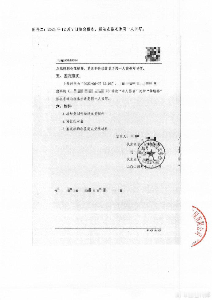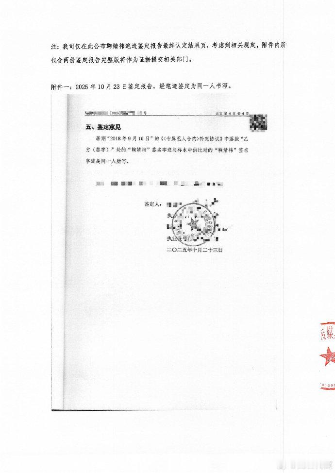丝芭晒笔迹鉴定报告丝芭否认伪造鞠婧祎签名 刚刚,回应“伪造鞠婧祎笔迹签字”一事,并晒出笔迹鉴定报告,称“署期2018年9月10日的《补充协议》中落款乙方签字处的鞠婧祎签名字迹与样本中供比对的鞠婧祎签名字迹是同一人所写”,表示鞠婧祎方近日就笔迹鉴定所陈述内容与事实不符。