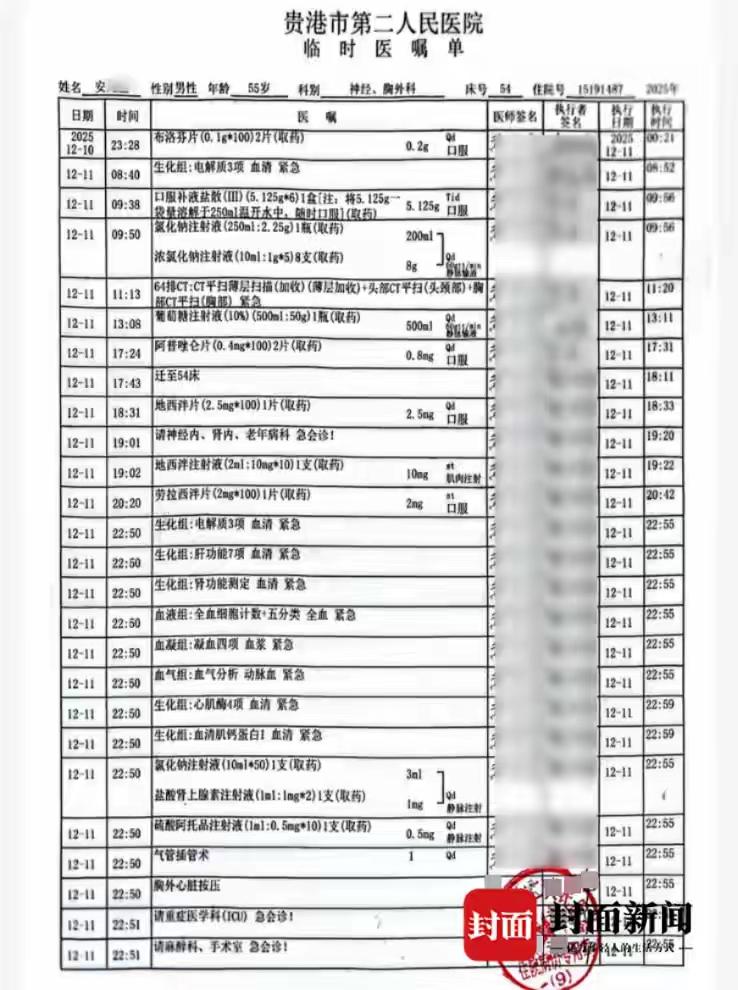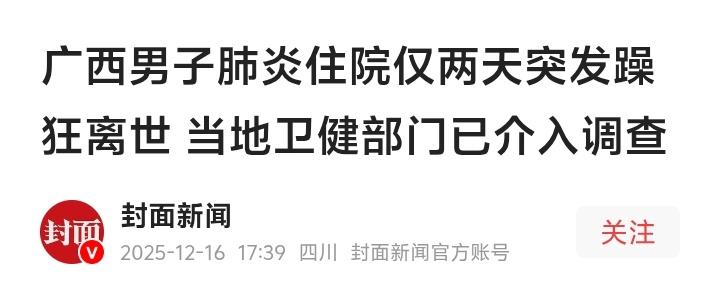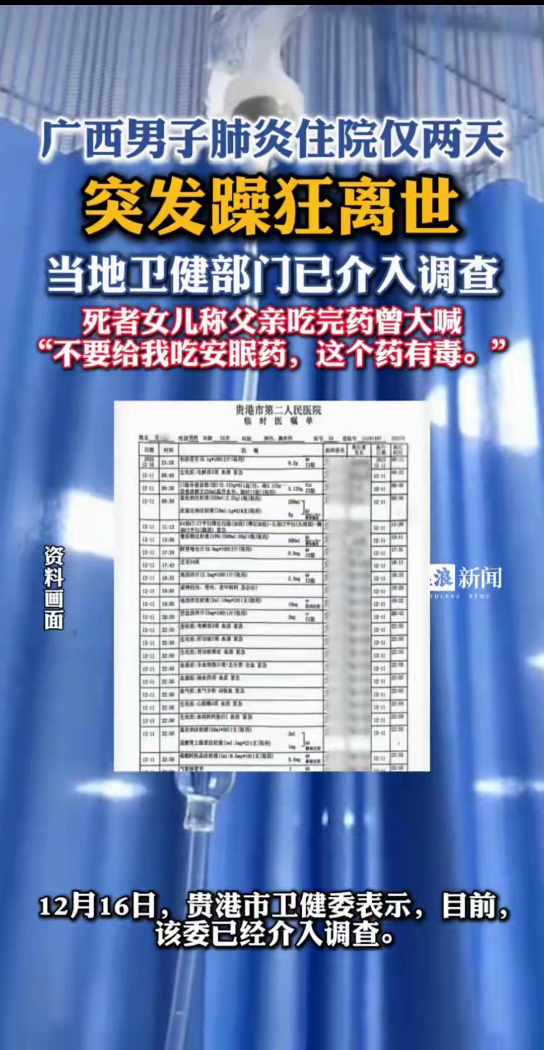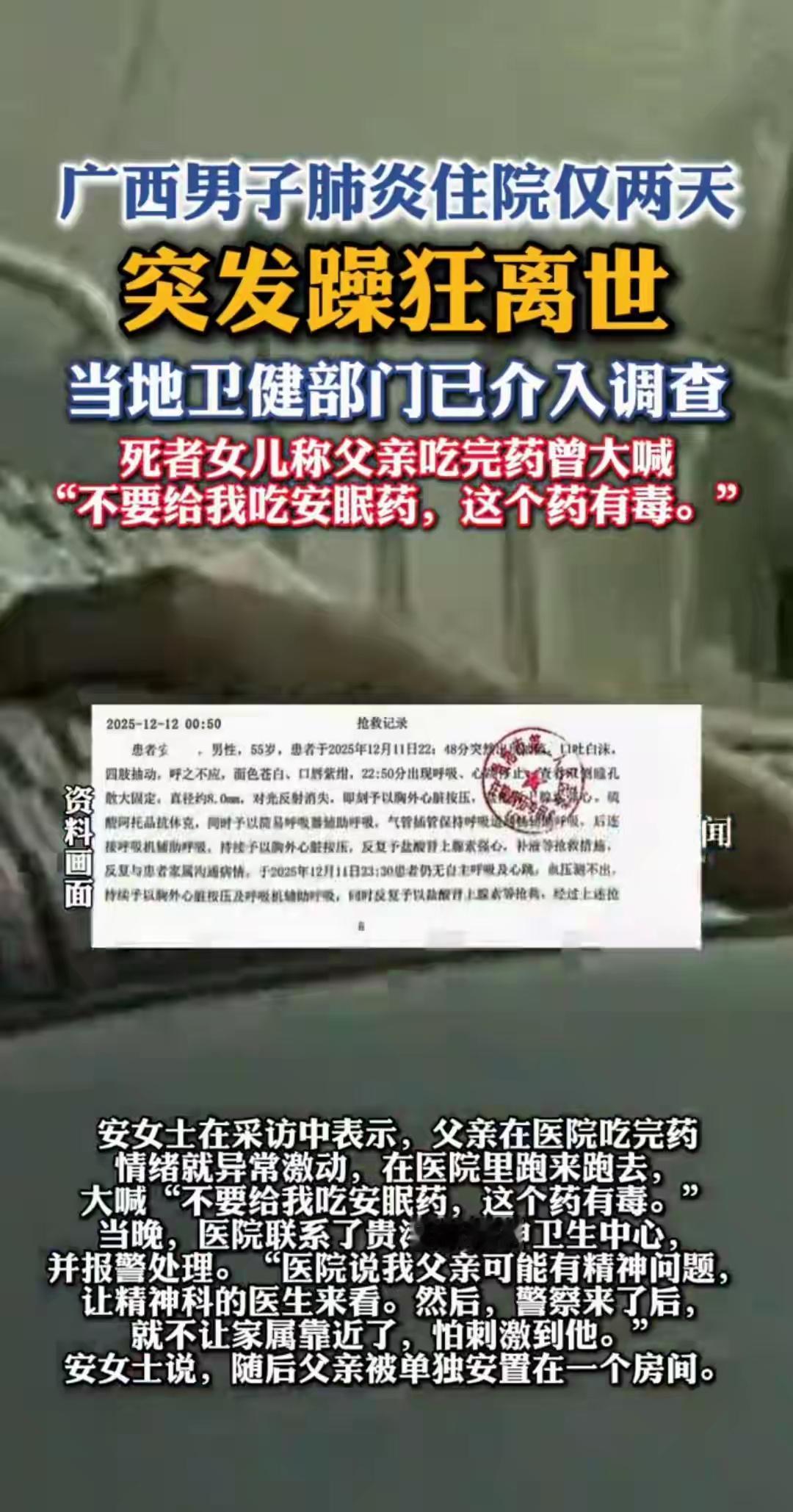 广西贵港55岁父亲咳嗽入院两天后暴毙!家属哭诉:他死前狂喊“药有毒”,医院冷漠回应“走法律” 来源:综合封面新闻、巷口百小生、专注的80后及网络平台热议) 谁能想到,一场看似普通的咳嗽,竟会在48小时内演变成一场天人永隔的悲剧?广西贵港,55岁的安富生(化名)走进医院时,还能自己走路,心里盘算着几天后出院回家。仅仅两天后,他却在一系列令人费解的躁狂与抢救中,变成了一具冰冷的遗体。女儿安女士握着父亲生前的照片,眼泪早已流干,只剩下满腹的疑问和锥心的痛:“我爸进去时还好好的,怎么突然就没了?” 这一切始于12月10日那个下午。咳嗽了半个多月的安富生,在妻子陪伴下走进了贵港市第二人民医院。诊断书上写着“社区获得性肺炎(非重症)”,医生语气轻松,说住几天院调理一下就好。这就像我们每个人都会经历的小病小痛,谁也没嗅到死亡的气息。安女士接到母亲电话说父亲“不对劲”时,心里还存着一丝侥幸,或许只是病情反复。 当她从南宁匆匆赶到贵港市第二人民医院,看到的父亲尚能交流。医生轻描淡写地解释是“轻微肺炎,有点缺钾缺钠”。然而,傍晚六点半,父亲服下护士递来的药后,瞬间变成了另一个人。他拔掉针头,在病房里狂奔嘶吼:“不要给我吃安眠药!这个药有毒!”那绝望的呐喊,至今回荡在安女士耳边。一个从未有过精神病史的朴实男人,为何突然癫狂? 更让家属心寒的是后续。面对失控的患者,院方没有立即采取有效医疗干预,而是建议家属“带他出院”,甚至联系了精神卫生中心并报警。家属被警察拦在远处,眼睁睁看着父亲被单独隔离。那种无力感,仿佛被抛入深海,呼喊无声。晚上十点多,当他们被允许靠近时,看到的已是抢救场景。凌晨时分,父亲被宣告死亡。从躁狂到死亡,仅六个小时。 医院出具的《病程记录》冰冷地记载着时间线,却给不出“病因”。家属多次沟通,只换来一句“去做鉴定,走法律途径”。这种冷漠,像一把盐撒在鲜血淋漓的伤口上。我们不禁要问,当生命在院内急速陨落,沟通的通道为何率先关闭?那份本该有的共情与责任,去了哪里? 在舆论关注下,事情终于迎来转机。贵港市卫健委已介入调查,第三方司法鉴定机构也已完成尸检。真相还在路上,但家属的疑问亟待回答:药物是否为躁狂诱因?用药告知是否充分?抢救是否及时规范?每一个问号,都关乎生命尊严与医疗公信。我们等待的,不仅是一个家庭的答案,更是对医疗安全底线的一次审视。 安女士的诉求朴素而坚定:查明死因,厘清责任。这何尝不是所有患者家属的心声?当我们把至亲托付给医院,托付的是一份毫无保留的信任。这份信任,不应被冷漠的流程和推诿的话语所辜负。每一条生命都值得全力呵护与尊重,每一次意外的背后,都应有经得起追问的真相。 如今,网络上的猜测纷纭,有怀疑药物不良反应,有分析罕见疾病。但无论如何,程序合规不能掩盖人性温度,专业判断更需辅以有效沟通。此事已超出个案范畴,它叩问着医患之间那道信任的桥梁是否坚固。我们期待调查结果水落石出,告慰逝者,也给生者一个交代。 医疗安全 真相追踪