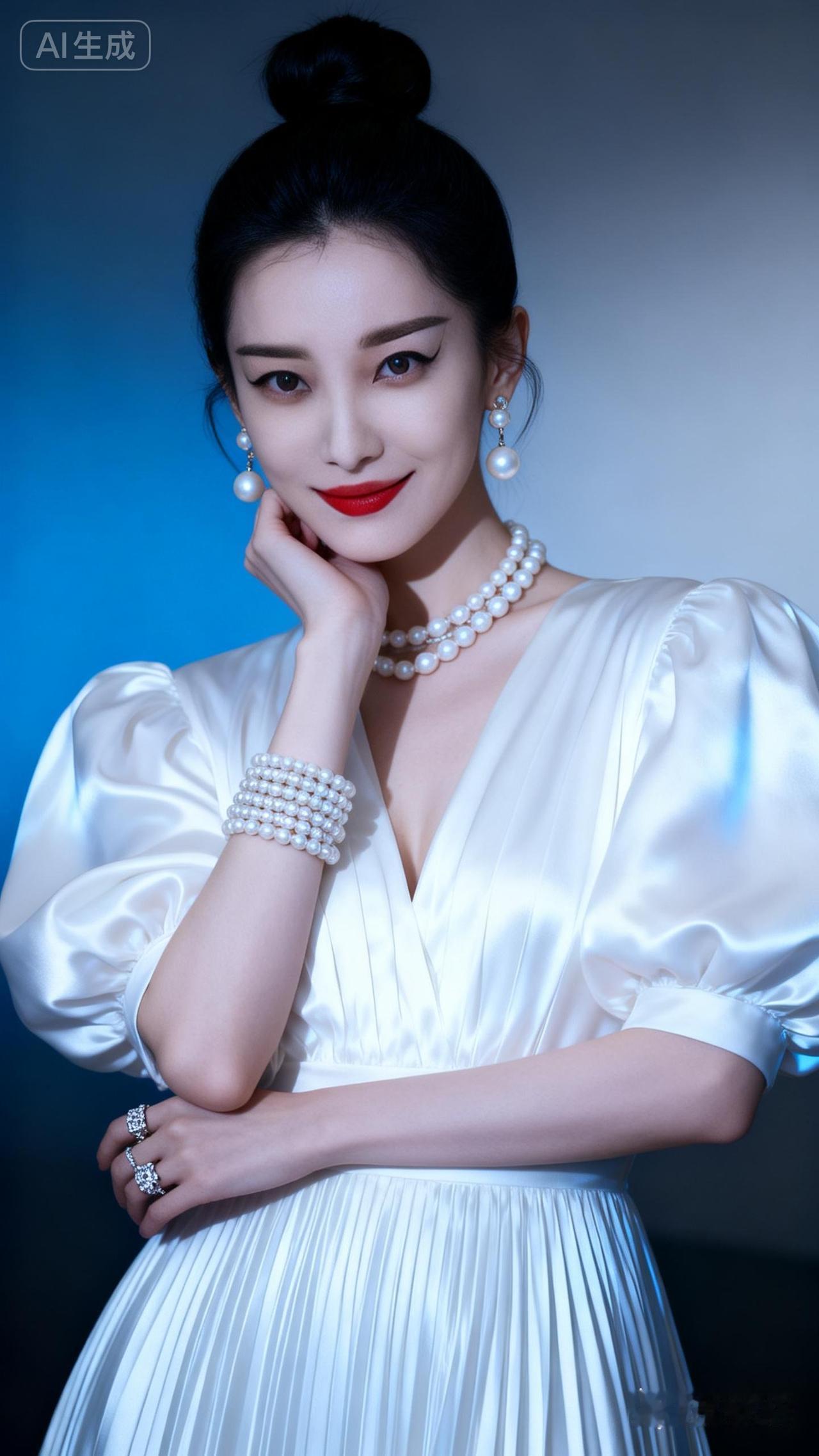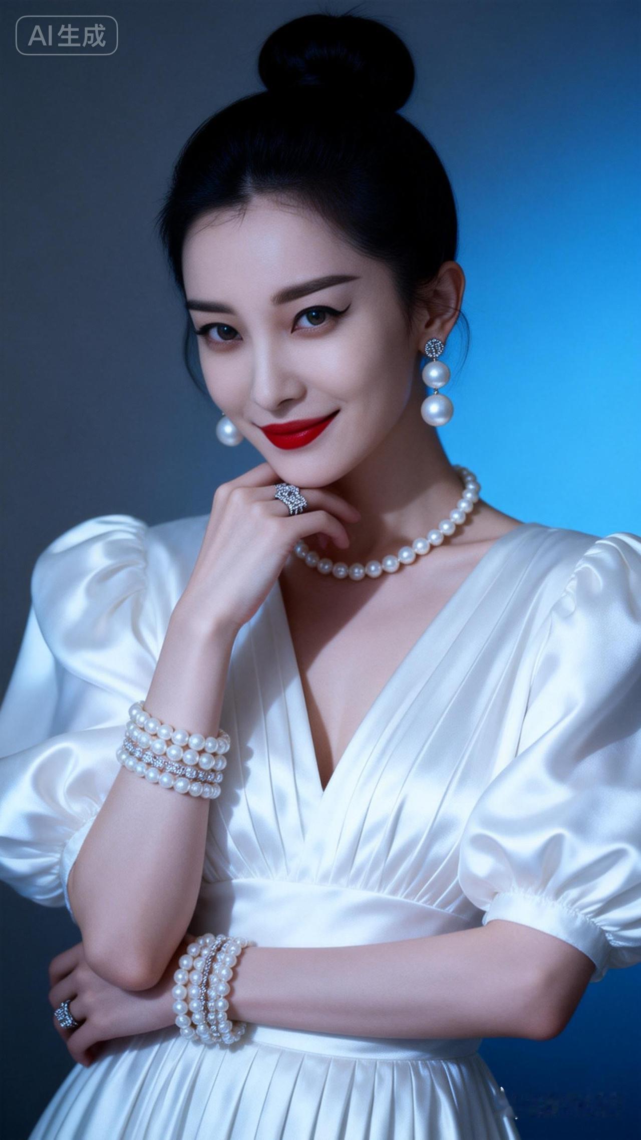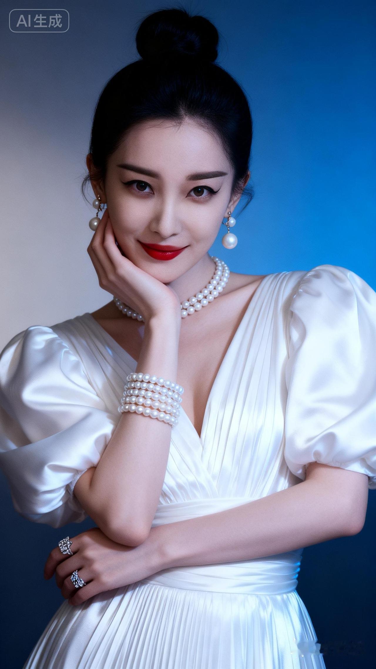 珠光宝气映红妆,玉手轻抚锦衣裳。