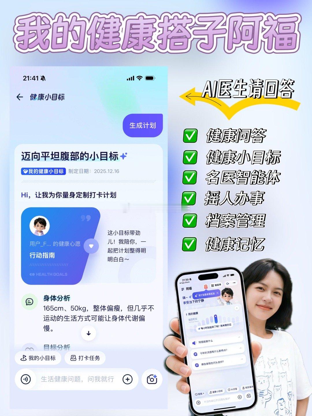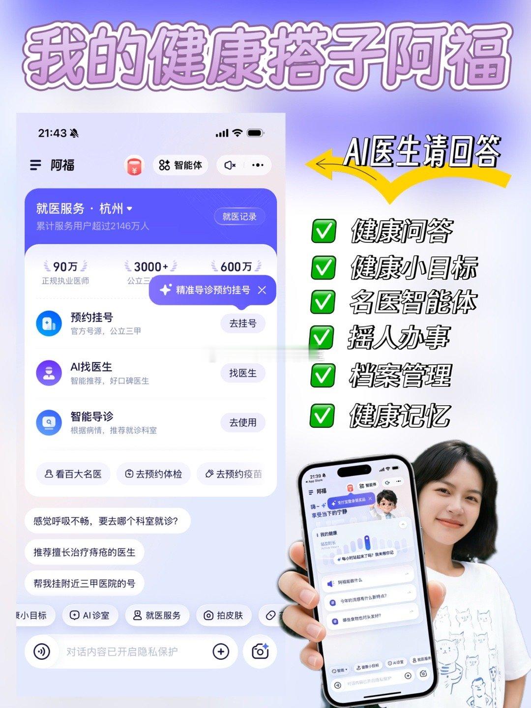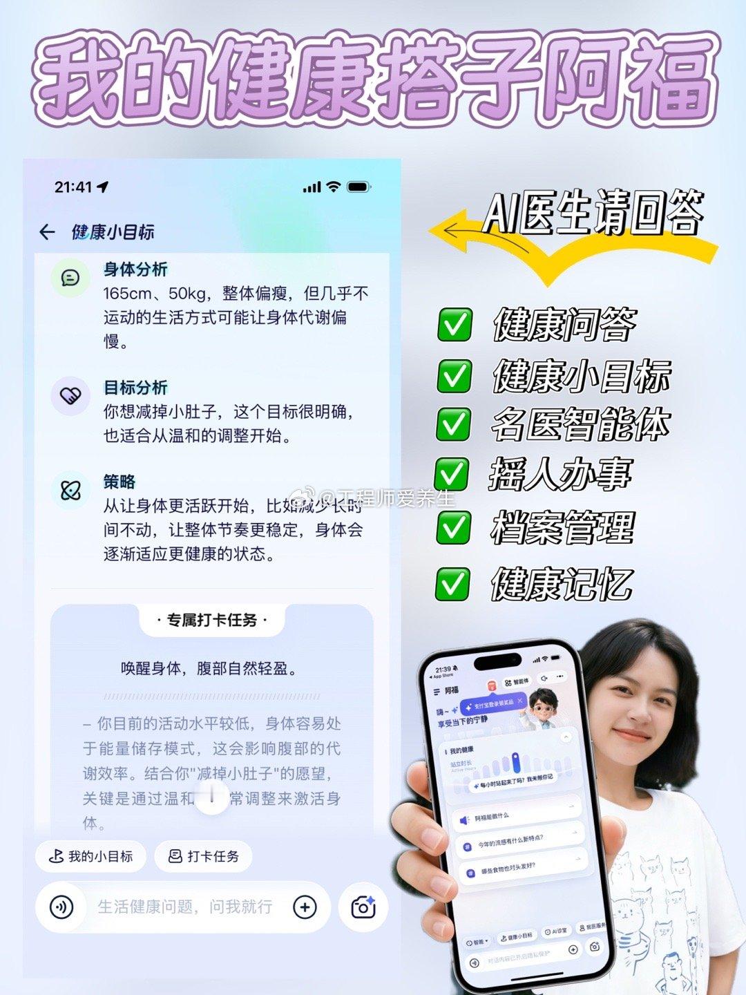 AI医生请回答 一起用阿福解决各种健康小问题!🎉🎉朋友们!即日起蚂蚁AQ升级为蚂蚁阿福了,跟着我一起来体验蚂蚁阿福的新功能吧,看看蚂蚁阿福是怎样全方位陪伴我们的健康生活的!🤖🤖🤖🤖🤖手机屏幕上,💬 AI健康助手蚂蚁阿福正在为我定制一份专属的生发食谱,而同时,它已经默默记录了我父母过去三个月的血压波动趋势。📈“妈妈,我肚子上肉好多啊……”我对着手机叹了口气😔。屏幕上立刻跳出一个可爱的笑脸表情😊,紧接着是一行字:“别担心,我们可以一起设定‘平坦小腹’小目标!💪”这是蚂蚁集团全新升级的“蚂蚁阿福”App,从12月16日起,它正式从AQ升级为更亲切的“阿福”,寓意“健康是福”🍀,开始全方位陪伴用户的健康生活。🤖🤖🤖🤖🤖👉健康问答,我的私人营养师🍎最近工作压力大,我的头发掉得厉害😫。我尝试问阿福:“哪些食物对头发好?💇”❓“对头发好的食物通常富含蛋白质、维生素(如生物素、维生素A®、C、D、E)、矿物质(如铁、锌、硒)以及Omega-3脂肪酸等营养素。”还列举了一些常见且有助于头发健康的食物。我注意到,阿福的回答明显不是从网上随便复制粘贴的。它引用了具体的营养成分,甚至提醒我“如果脱发严重,建议咨询皮肤科医生👨”。这种一对一、量身定制的对话方式,正是阿福从“工具”转向“AI健康朋友”的核心变化。🌟🤖🤖🤖🤖🤖👉陪伴与专家,全天候的健康守护🛡️我设定了“迈向平坦小腹”的目标🎯。阿福立即化身我的“私人教练”🏋️,不是简单地告诉我“多做运动”,而是先根据我的身高、体重、年龄,运动习惯等制定了一份循序渐进的计划。“第一周每天进行15分钟核心训练+6000步步行🚶,第二周逐步增加强度…” 更贴心的是,它每天都会推送提醒:“别忘了今天的运动计划哦!💪🔥”🤖🤖🤖🤖🤖👉我还尝试了“名医智能体”功能。app里的百大名医由院士领衔,AI分身👨👩24小时免费提供咨询⏰。我咨询了睡眠问题😴,毛洪京医生的AI分身不仅解释了失眠的常见原因,还提供了非药物改善建议。这位专家感慨道,从前他一年最多服务1万例患者,如今他的AI分身一年就服务了368万用户👥!惊人吧?🤯对于需要进一步诊疗的情况,阿福还能连接全国30万真人医生提供在线问诊服务💻。✅“摇人办事”功能也很实用!🔄 我可以快速找到附近的医院、药店💊,甚至预约体检服务,非常方便!👍🤖🤖🤖🤖🤖👉家庭健康,一站式的档案管家👨👩👧👦作为“上有老,下有小”的中年人,我最头疼的是管理全家人的健康信息。🤯在阿福上,我为父母创建了健康档案📁。通过绑定他们的智能设备,血压、心率等数据自动同步到App。阿福甚至会追踪分析他们的健康走势,像“家庭医生”一样提示异常变化🚨。最让我安心的是“健康记忆”功能🧠。我将父母过去的体检报告📄拍照上传,阿福不仅能解读单份报告,还能进行多份报告的对比分析,准确率超过95%📊!最近一次,系统提示父亲近三个月血压有缓慢上升趋势📈,建议调整饮食并加强监测。这种前瞻性的健康管理,正是我们这些无法常伴父母身边的子女最需要的。❤️阿福与苹果手表⌚️打通的功能更让我惊喜——一旦老人意外跌倒,手表不仅能自动识别、一键求助🆘,还可以直接连通24小时在线医生进行急救指导!这对于远在他乡工作的我来说,简直是莫大的安慰😌。🤖🤖🤖🤖🤖👉隐私与普惠,值得信赖的AI朋友🤝使用过程中,我特别关注隐私保护🔒。阿福的“无痕拍”模式让我放心——上传的任何照片都会全程打码处理。蚂蚁集团副总裁张俊杰保证,阿福会“像朋友一样嘴严,放心可靠”🤐。数据显示,阿福每天回答用户500多万个健康提问❓,其中55%来自三线以下城市🏘️。这意味着,即使在医疗资源相对匮乏的地区,人们也能通过阿福获得专业、及时的健康指导。🌍从浙江省卫健委与蚂蚁健康共创的数字陪诊师“安诊儿”,到今天面向全国用户的“阿福”,这个AI健康朋友正在让专业的健康服务变得更加普惠。🌈🤖🤖🤖🤖🤖今天早上,阿福准时提醒我:“该测量血压了哦!📱” 而昨晚,它已经根据我父亲的睡眠数据,给出了改善建议。😴这个小小的App图标安静地躺在我的手机屏幕上,不再只是一个工具🛠️。它记得我孩子的过敏史🤧、我母亲的降压药服用时间⏰、我为“平坦小腹”目标付出的努力💦。在数字世界里,我真的多了一位关心全家健康的“朋友”。👫就像它的名字寓意的那样——健康是福🍀,而阿福,正成为守护这份福气的智能伙伴。🎉 现在就开始体验吧,让你的健康也有个AI朋友时刻相伴!🚀