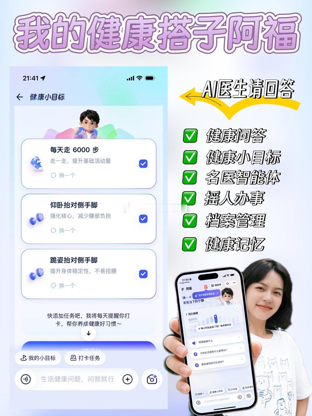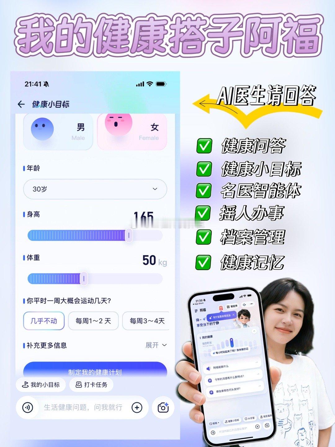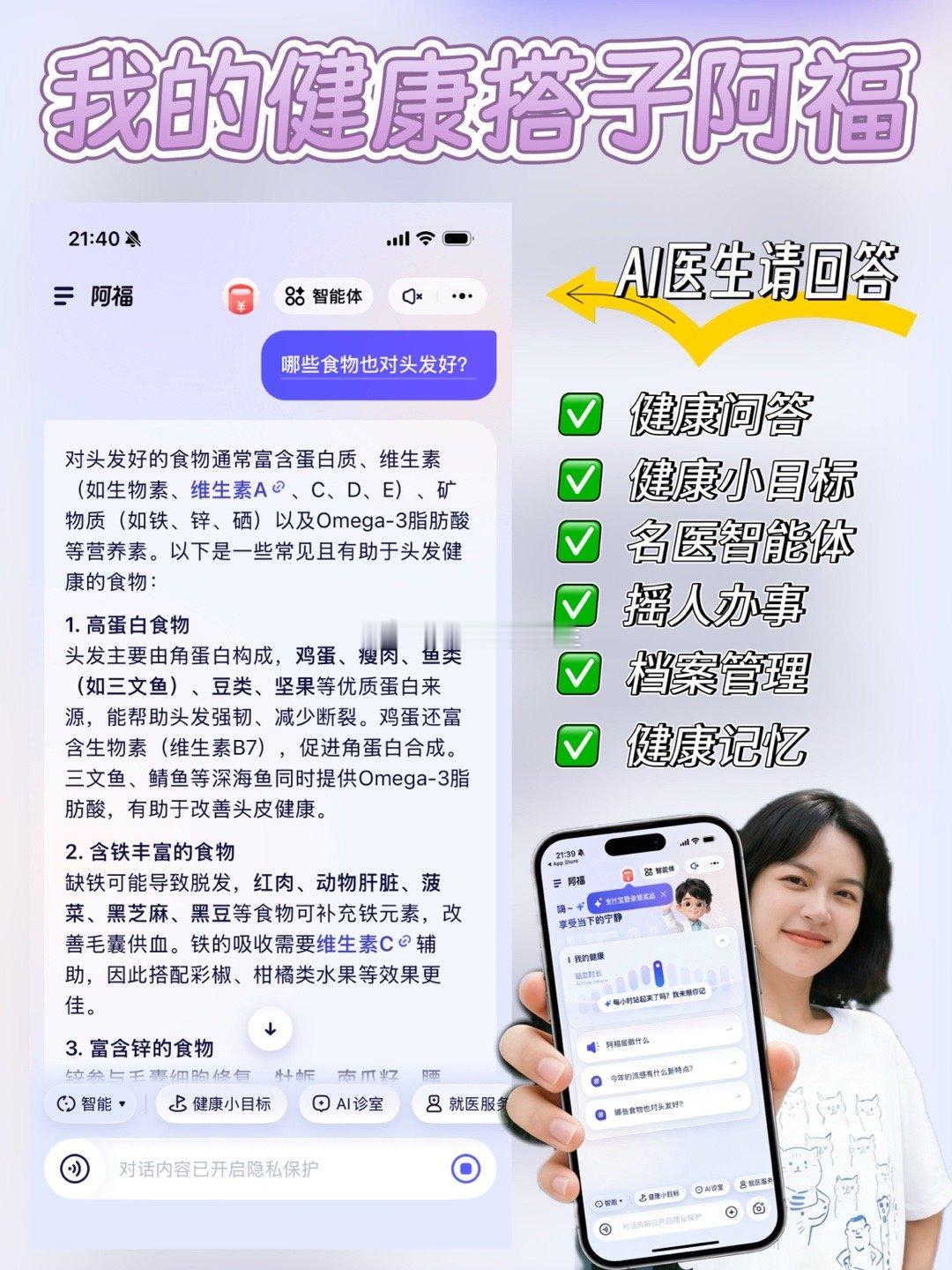 AI医生请回答 一起用阿福解决各种健康小问题!🎉🎉朋友们!即日起蚂蚁AQ升级为蚂蚁阿福了,跟着我一起来体验蚂蚁阿福的新功能吧,看看蚂蚁阿福是怎样全方位陪伴我们的健康生活的!🤖🤖🤖🤖🤖手机屏幕上,💬 AI健康助手蚂蚁阿福正在为我定制一份专属的生发食谱,而同时,它已经默默记录了我父母过去三个月的血压波动趋势。📈“妈妈,我肚子上肉好多啊……”我对着手机叹了口气😔。屏幕上立刻跳出一个可爱的笑脸表情😊,紧接着是一行字:“别担心,我们可以一起设定‘平坦小腹’小目标!💪”这是蚂蚁集团全新升级的“蚂蚁阿福”App,从12月16日起,它正式从AQ升级为更亲切的“阿福”,寓意“健康是福”🍀,开始全方位陪伴用户的健康生活。🤖🤖🤖🤖🤖👉健康问答,我的私人营养师🍎最近工作压力大,我的头发掉得厉害😫。我尝试问阿福:“哪些食物对头发好?💇”❓“对头发好的食物通常富含蛋白质、维生素(如生物素、维生素A®、C、D、E)、矿物质(如铁、锌、硒)以及Omega-3脂肪酸等营养素。”还列举了一些常见且有助于头发健康的食物。我注意到,阿福的回答明显不是从网上随便复制粘贴的。它引用了具体的营养成分,甚至提醒我“如果脱发严重,建议咨询皮肤科医生👨”。这种一对一、量身定制的对话方式,正是阿福从“工具”转向“AI健康朋友”的核心变化。🌟🤖🤖🤖🤖🤖👉陪伴与专家,全天候的健康守护🛡️我设定了“迈向平坦小腹”的目标🎯。阿福立即化身我的“私人教练”🏋️,不是简单地告诉我“多做运动”,而是先根据我的身高、体重、年龄,运动习惯等制定了一份循序渐进的计划。“第一周每天进行15分钟核心训练+6000步步行🚶,第二周逐步增加强度…” 更贴心的是,它每天都会推送提醒:“别忘了今天的运动计划哦!💪🔥”🤖🤖🤖🤖🤖👉我还尝试了“名医智能体”功能。app里的百大名医由院士领衔,AI分身👨👩24小时免费提供咨询⏰。我咨询了睡眠问题😴,毛洪京医生的AI分身不仅解释了失眠的常见原因,还提供了非药物改善建议。这位专家感慨道,从前他一年最多服务1万例患者,如今他的AI分身一年就服务了368万用户👥!惊人吧?🤯对于需要进一步诊疗的情况,阿福还能连接全国30万真人医生提供在线问诊服务💻。✅“摇人办事”功能也很实用!🔄 我可以快速找到附近的医院、药店💊,甚至预约体检服务,非常方便!👍🤖🤖🤖🤖🤖👉家庭健康,一站式的档案管家👨👩👧👦作为“上有老,下有小”的中年人,我最头疼的是管理全家人的健康信息。🤯在阿福上,我为父母创建了健康档案📁。通过绑定他们的智能设备,血压、心率等数据自动同步到App。阿福甚至会追踪分析他们的健康走势,像“家庭医生”一样提示异常变化🚨。最让我安心的是“健康记忆”功能🧠。我将父母过去的体检报告📄拍照上传,阿福不仅能解读单份报告,还能进行多份报告的对比分析,准确率超过95%📊!最近一次,系统提示父亲近三个月血压有缓慢上升趋势📈,建议调整饮食并加强监测。这种前瞻性的健康管理,正是我们这些无法常伴父母身边的子女最需要的。❤️阿福与苹果手表⌚️打通的功能更让我惊喜——一旦老人意外跌倒,手表不仅能自动识别、一键求助🆘,还可以直接连通24小时在线医生进行急救指导!这对于远在他乡工作的我来说,简直是莫大的安慰😌。🤖🤖🤖🤖🤖👉隐私与普惠,值得信赖的AI朋友🤝使用过程中,我特别关注隐私保护🔒。阿福的“无痕拍”模式让我放心——上传的任何照片都会全程打码处理。蚂蚁集团副总裁张俊杰保证,阿福会“像朋友一样嘴严,放心可靠”🤐。数据显示,阿福每天回答用户500多万个健康提问❓,其中55%来自三线以下城市🏘️。这意味着,即使在医疗资源相对匮乏的地区,人们也能通过阿福获得专业、及时的健康指导。🌍从浙江省卫健委与蚂蚁健康共创的数字陪诊师“安诊儿”,到今天面向全国用户的“阿福”,这个AI健康朋友正在让专业的健康服务变得更加普惠。🌈🤖🤖🤖🤖🤖今天早上,阿福准时提醒我:“该测量血压了哦!📱” 而昨晚,它已经根据我父亲的睡眠数据,给出了改善建议。😴这个小小的App图标安静地躺在我的手机屏幕上,不再只是一个工具🛠️。它记得我孩子的过敏史🤧、我母亲的降压药服用时间⏰、我为“平坦小腹”目标付出的努力💦。在数字世界里,我真的多了一位关心全家健康的“朋友”。👫就像它的名字寓意的那样——健康是福🍀,而阿福,正成为守护这份福气的智能伙伴。🎉 现在就开始体验吧,让你的健康也有个AI朋友时刻相伴!🚀