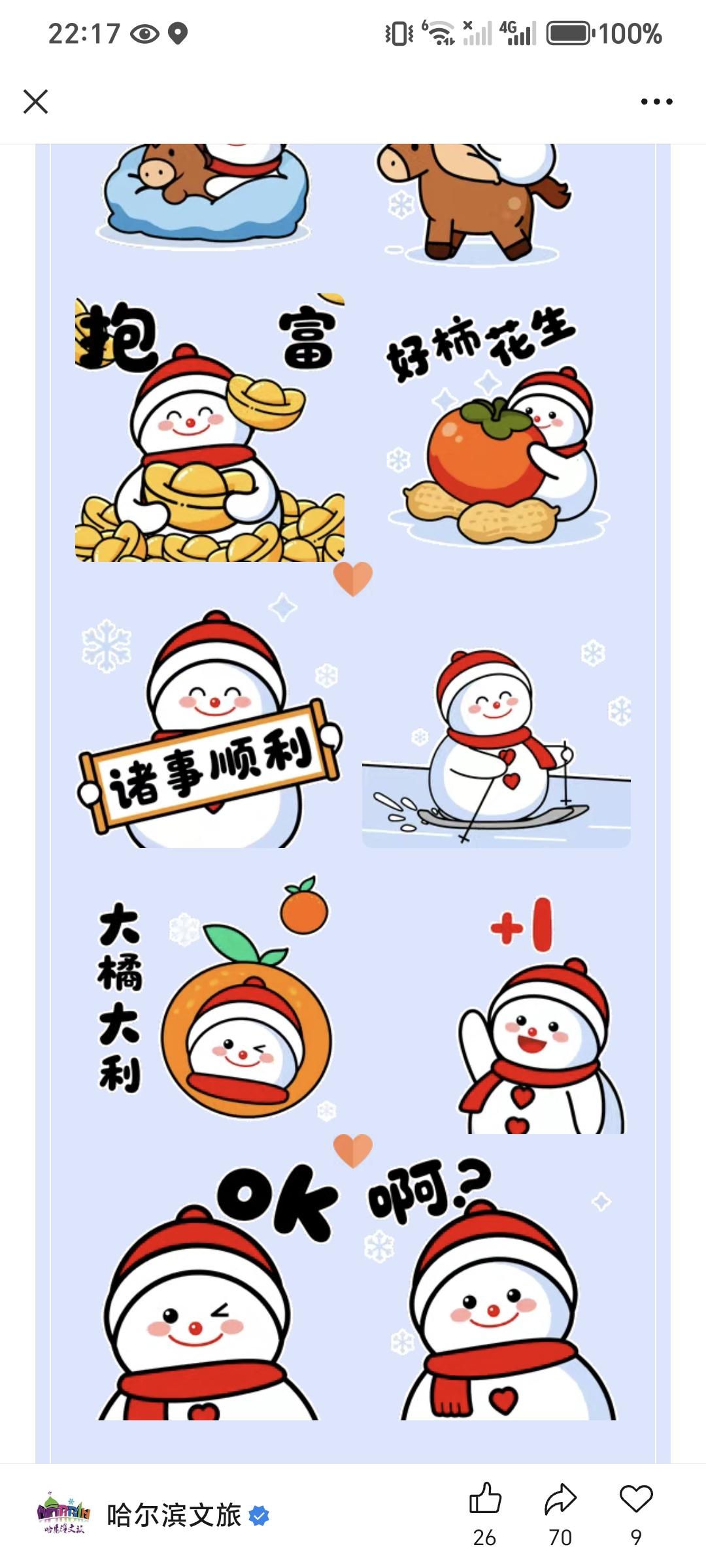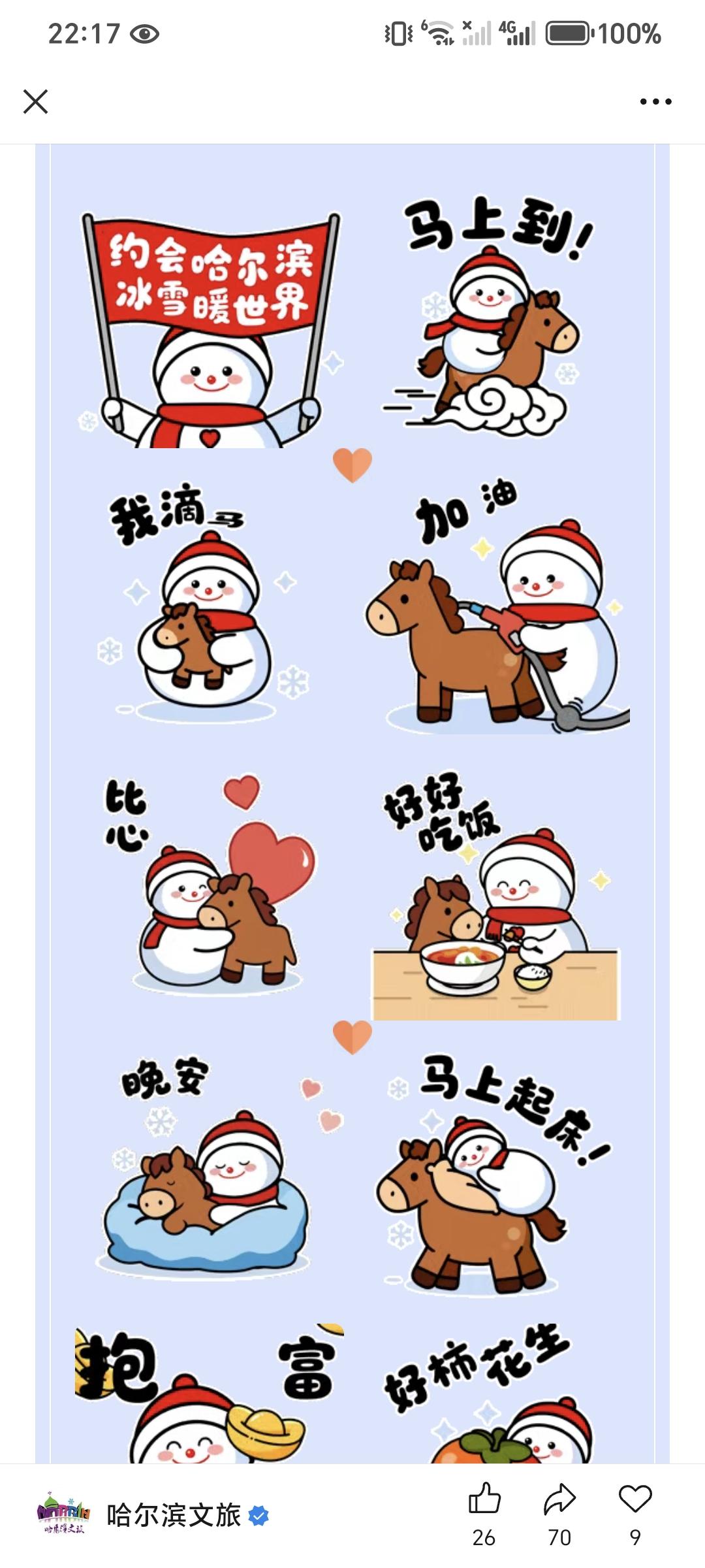 网红雪人☃️表情包来喽,非常可爱,大雪人和小马组成的一个具备辨识度的表情包! 很有特点,而且和2026年的马属相相结合!寓意,冬日里的活力感,雪人代表着冬季寒冷,而马象征奔跑和活力,就是在冬日也能保持着这份热爱和精力充沛的状态。 同时,哈尔滨也更具备这种饱满的热情,欢迎大家勇闯哈尔滨,感受这银装素裹的大地也能有绿色的希望。 图片素材来源于网络,侵权立删。