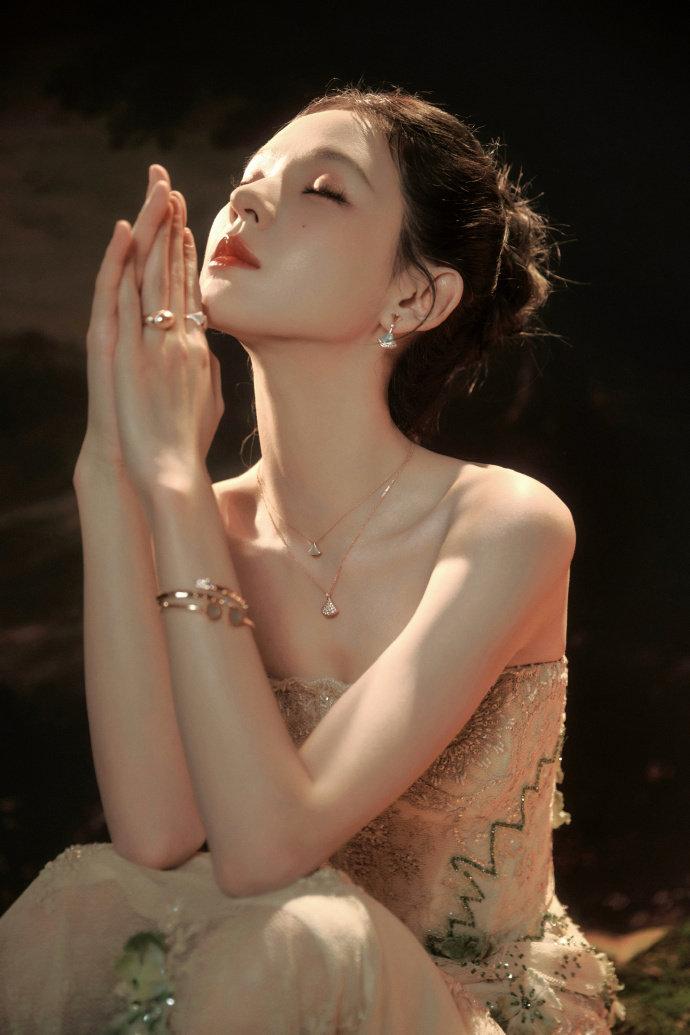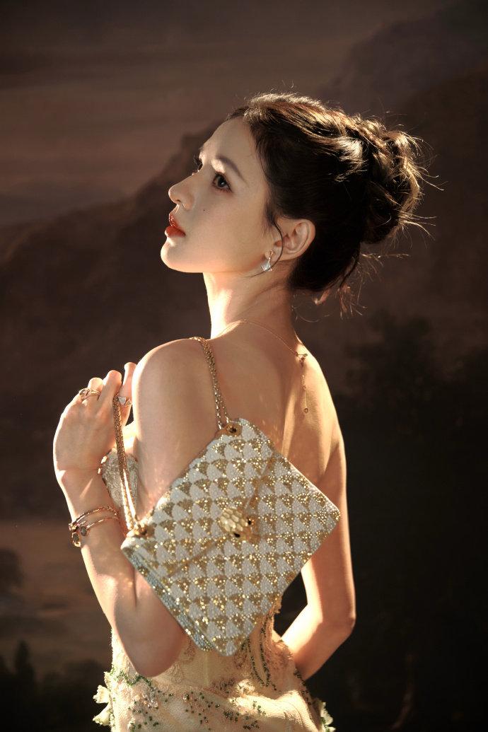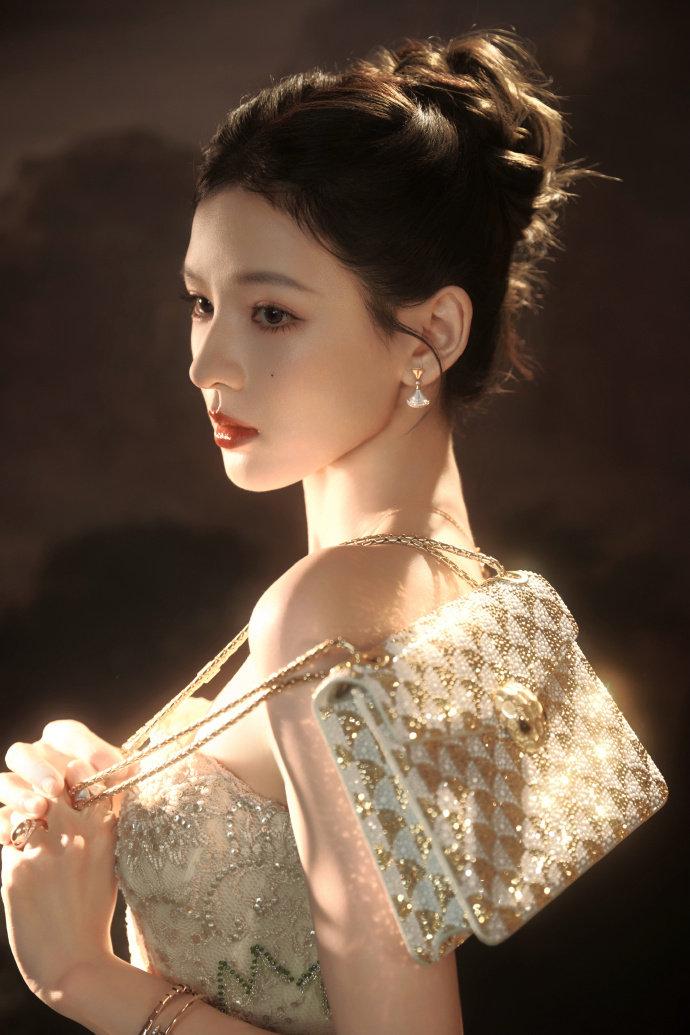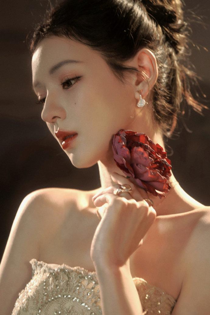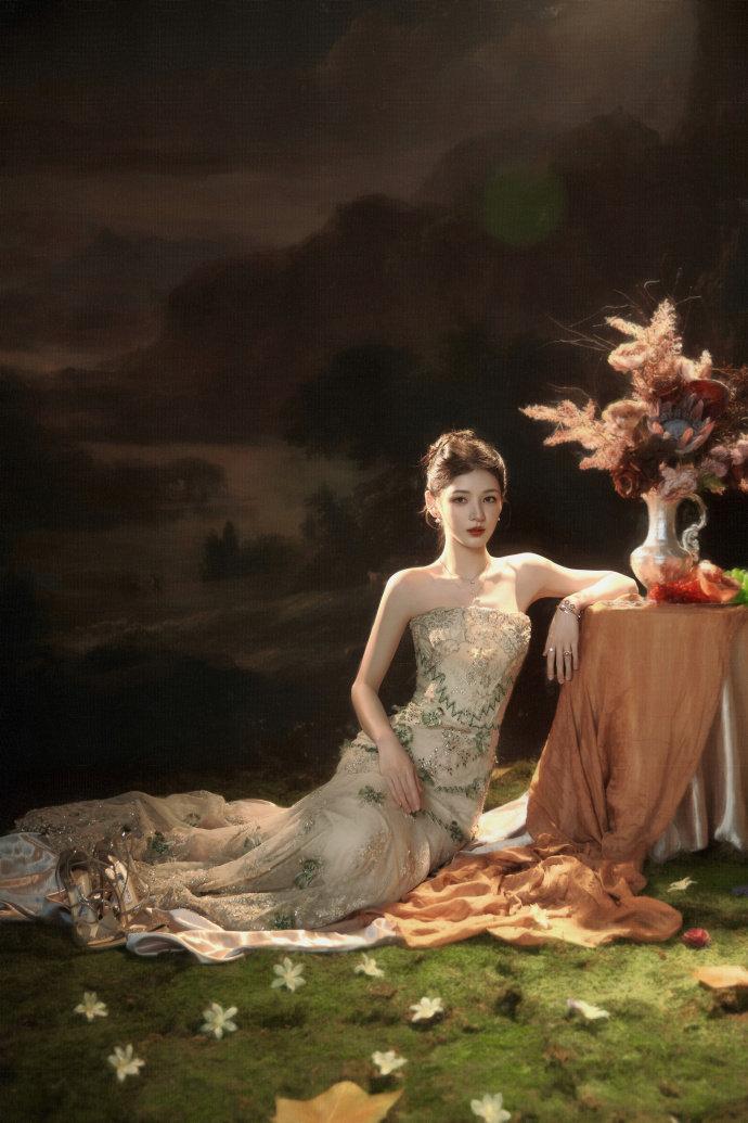 冬日国剧盛典,张予曦一袭缀满绿意刺绣的鎏金抹胸礼裙惊艳亮相,裙身碎钻在光影里流转,高盘发衬出精致肩颈线条,“冬天未眠的绿意”在她身上化作具象的温柔,清冷又灵动的气质拉满氛围感。