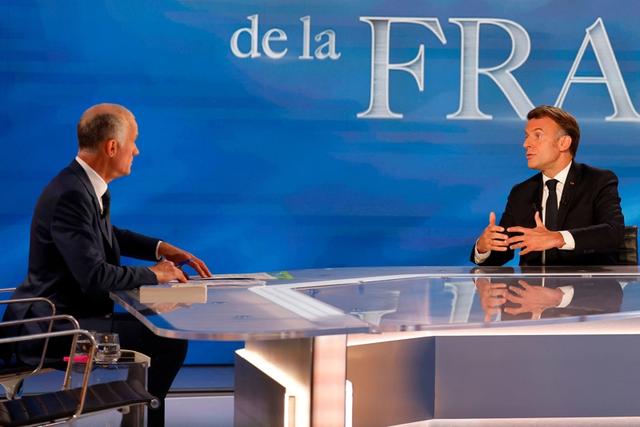 5月13日,法国总统马克龙(右)在圣但尼参加法国电视一台节目录制。马克龙在节目中说,欧洲若始终依赖美国将是“不负责任”。新华社