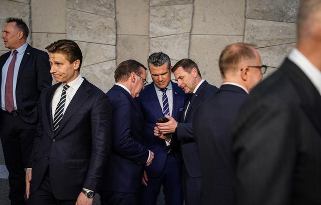 10月15日,在比利时布鲁塞尔举行的北约防长会议结束后,美国国防部长赫格塞思(中)与爱沙尼亚国防部长佩夫库尔(右三)、德国国防部长皮斯托里乌斯(左三)交谈。新华社