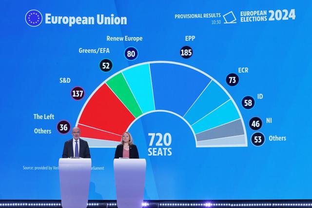 2024年6月,欧洲议会选举,右翼和极右翼政党席位增加。这是2024年6月10日在位于比利时布鲁塞尔的欧洲议会拍摄的选举临时结果。新华社