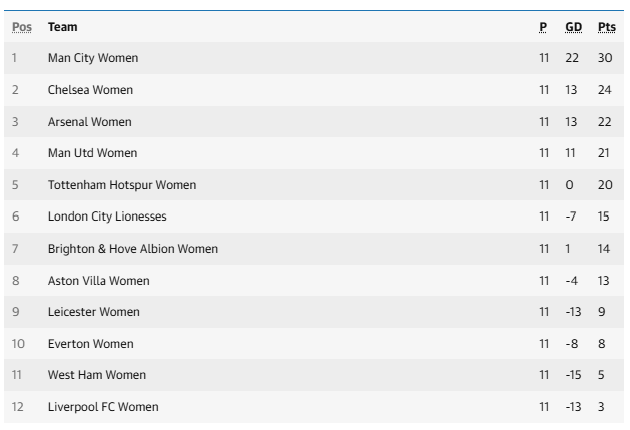 虎扑12月16日讯随着英格兰女足超级联赛进入冬歇期,《卫报》对本赛季前半程进行了盘点。11轮战罢,曼城女足表现最为抢眼,而上赛季欧冠冠军阿森纳则略显失色。