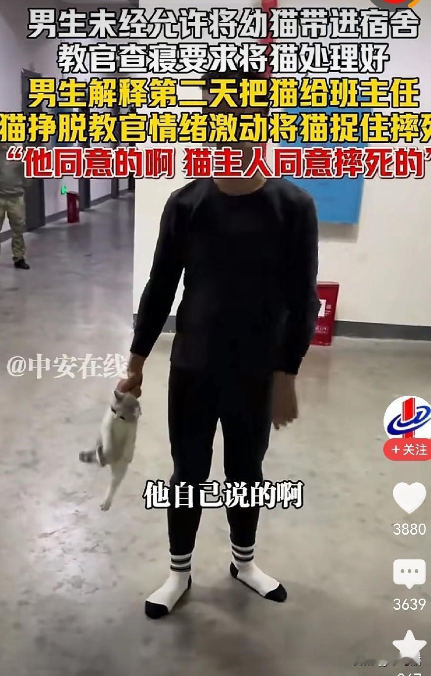 湖南湘西教官摔猫的事儿,现在闹得沸沸扬扬。不管视频里学生有多挑衅,不管教官当时觉得自己多占理,他这饭碗肯定是保不住了,处罚那是板上钉钉的事儿。 说真的,这事儿本来完全能大事化小。学生违规在宿舍养猫,确实不对,教官想管也没毛病。但他错就错在,一门心思要给学生下马威,非要争那口气。他但凡闭嘴不掺和,就交给让班主任去处理,哪还有后面这些烂事? 而且啊,就算想找回面子,有的是合规的办法。通报批评、记个过,再不济罚学生抄几遍纪律章程,哪样不比直接摔猫强?既维护了规矩,又能让学生服气。可他偏不,脑子一热就把气撒在一只小猫身上,忘了那也是条活生生的命。说真的,看他一下二下摔猫的视频,真的太狠心了。 这下好了,意气用事的代价来了,工作没了,还被全网骂。你说这面子能值几个钱?这事儿也算给所有人提了个醒:不管遇到什么事儿,都别上头,冲动解决不了任何问题,只会让事情越来越糟。一个成年人和一群就当不懂事的学生较劲,真没必要啊。