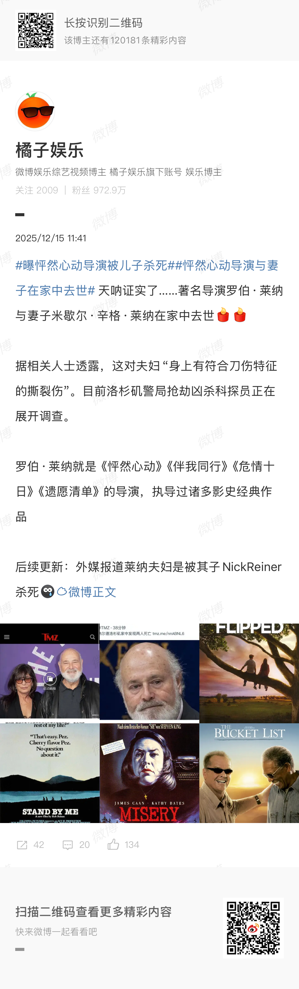 据外媒,洛杉矶县地方检察官宣布,《怦然心动》导演罗伯·莱纳的儿子尼克·莱纳被控两项一级谋杀罪,罪名是谋杀父母。若罪名成立,将面临无假释终身监禁。好唏嘘……导演的经典代表作《怦然心动》的片尾还是致谢儿子给予他灵感💧12月15日,著名导演罗伯·莱纳与妻子米歇尔·辛格·莱纳在家中去世,随后据知情人爆料凶手正是其子尼克·莱纳。(p3-4)罗伯莱纳儿子被指控谋杀父母怦然心动片尾是罗伯莱纳致谢儿子