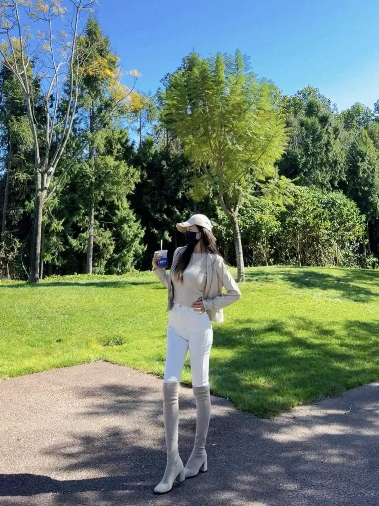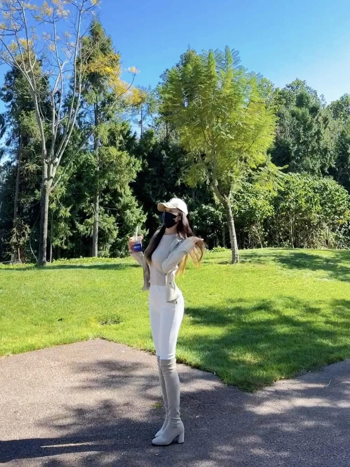 这么好的天不出来玩可惜了!你看这阳光晃得人心情都亮堂,穿这身奶白针织裙往公园一