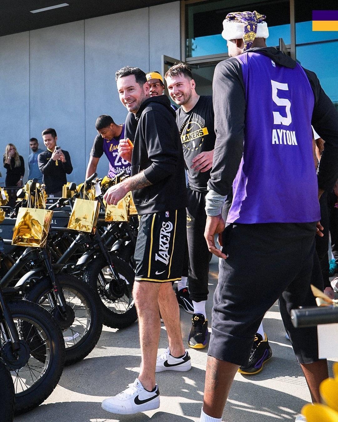 优质门面 热心队友 💜💛东契奇在圣诞节前夕给全队球员、教练组和篮球运营工作人员,每人赠送了一辆定制的电动自行车作为节日礼物,共计103份!🎄🎁湖人国度LakeShow东契奇圣诞节送全队电动自行车
