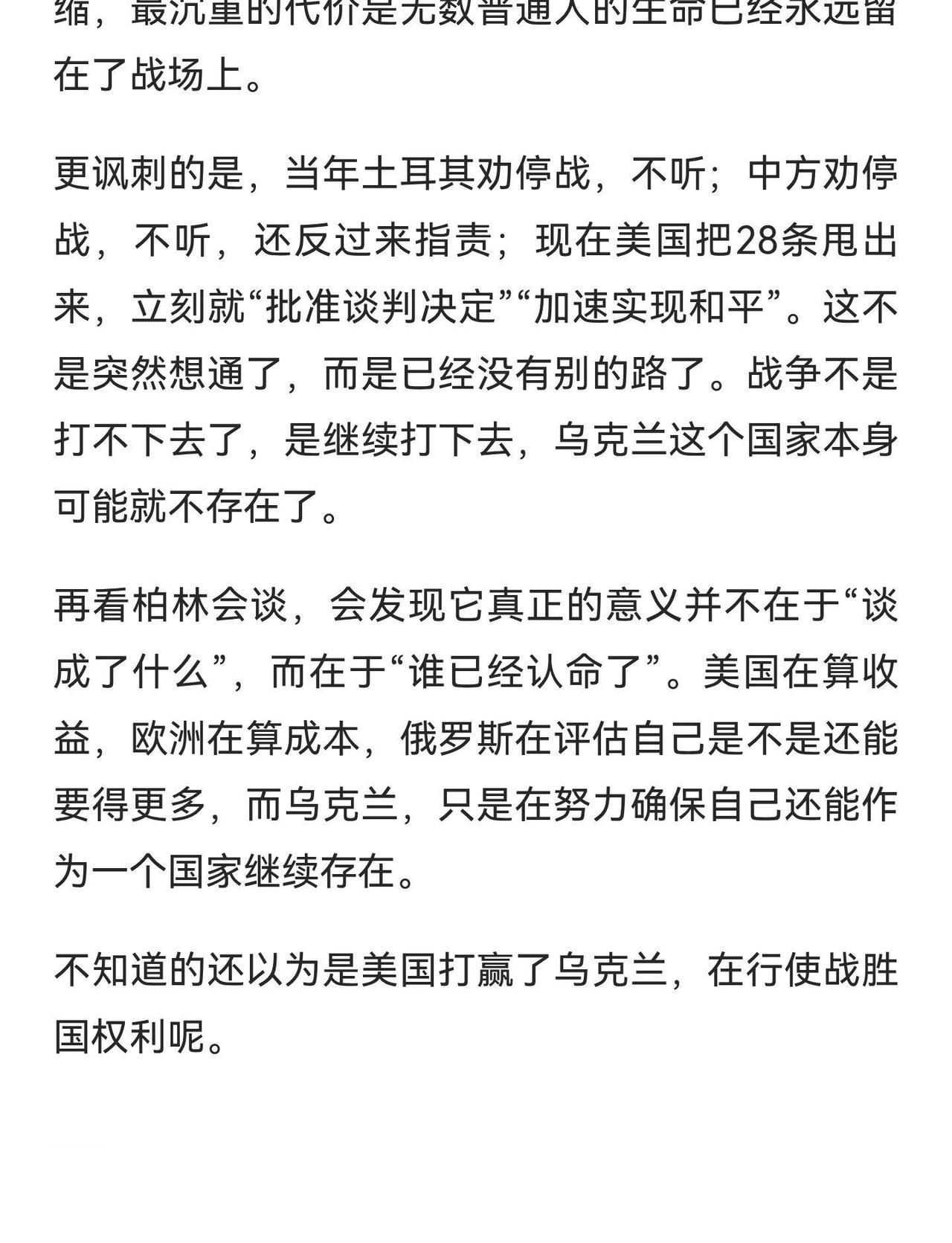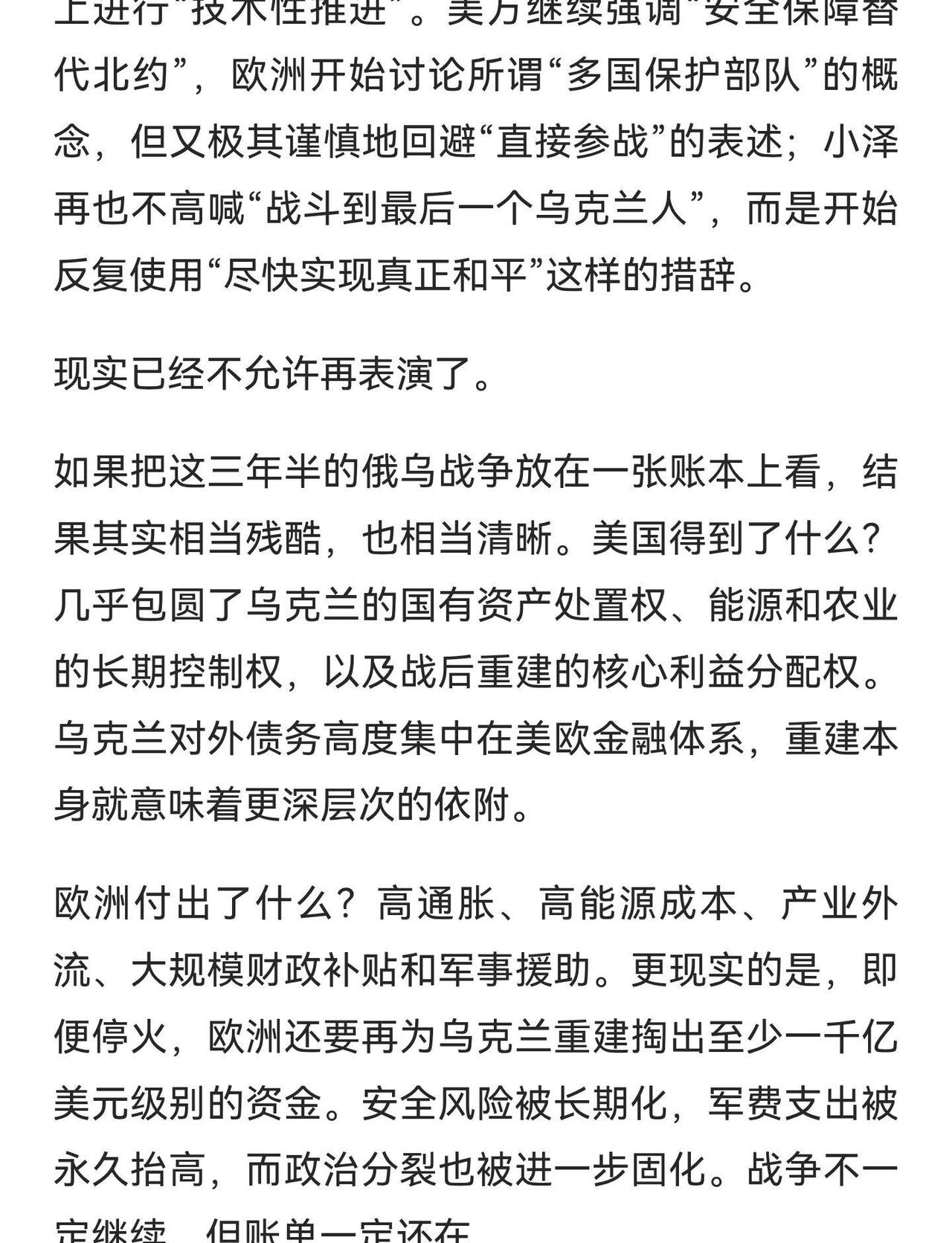 俄罗斯赢麻了 美国也赢麻了。 德国 俄乌战争 德国生活 德国移民 德国物价飞涨 希望世界和平 历史见证者 何李燃 柏林会谈确认各方心理建设,美国在俄乌和平框架中继续让步,欧洲讨论“多国保护部队”,俄罗斯维持战果并推动停火。乌克兰面临主权丧失和重建压力,欧洲承担巨额财政和安全成本,俄罗斯评估未来战略。 德国生活记录