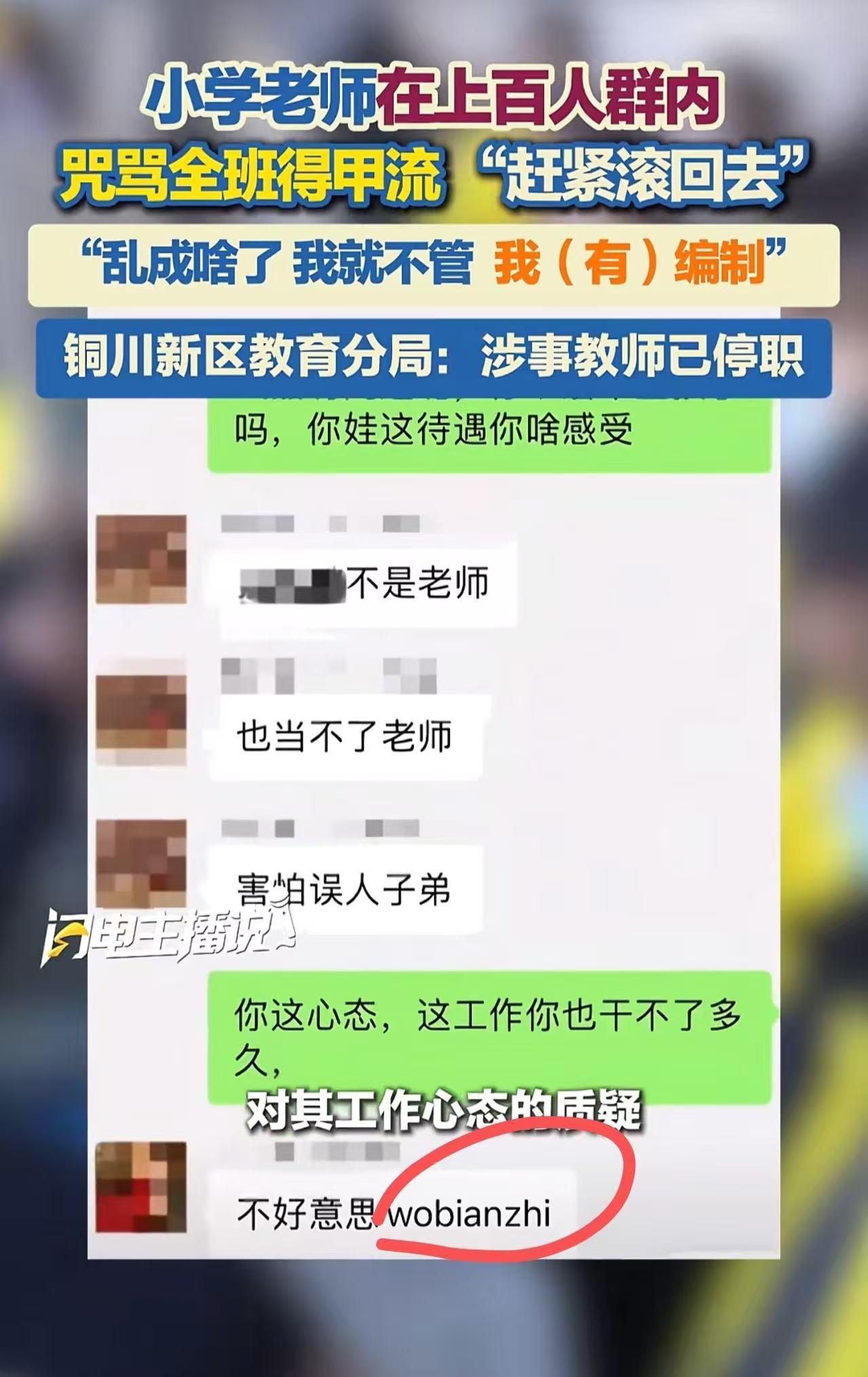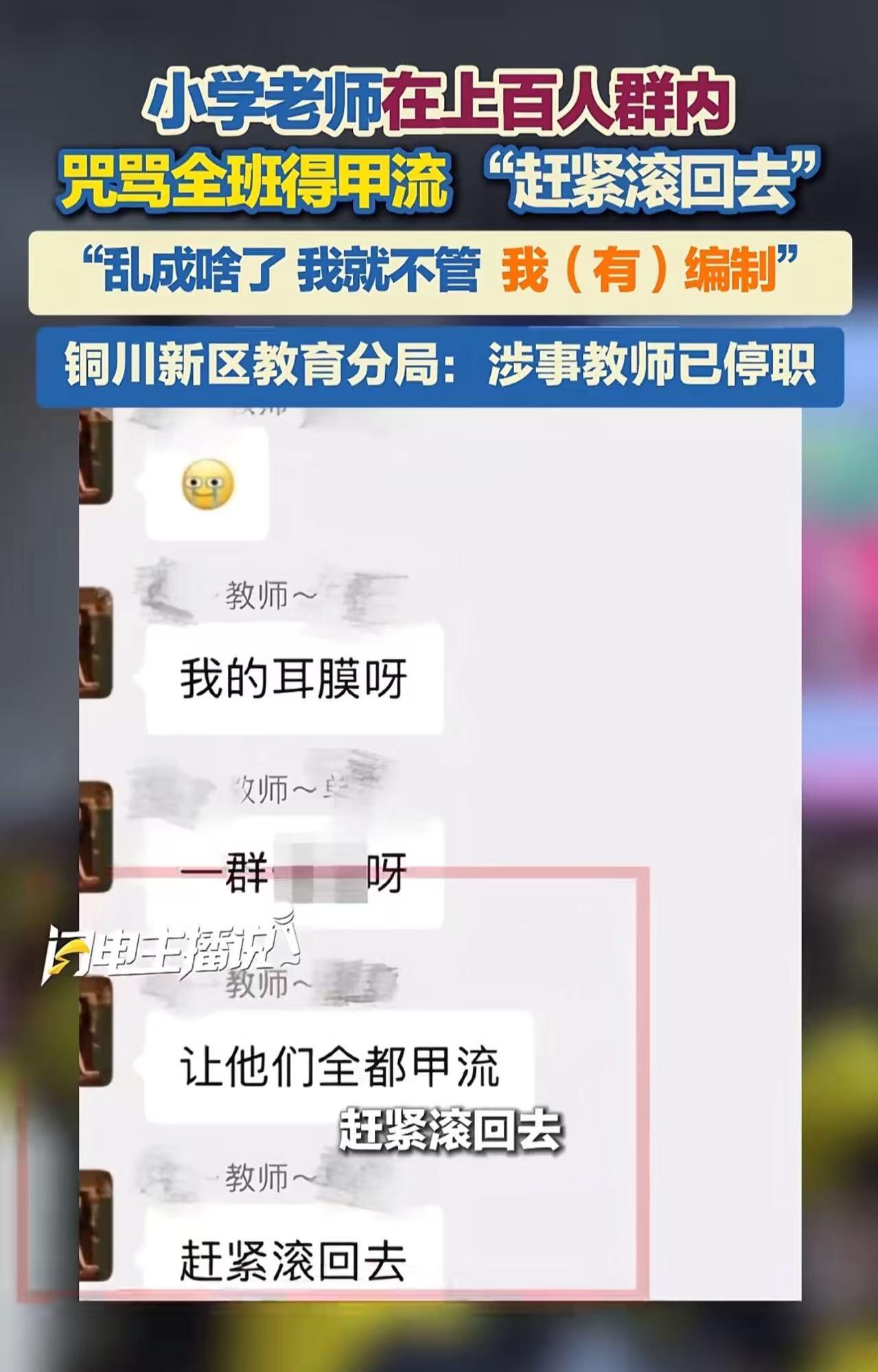 “有编制就是牛啊!”小学老师在上百人的群内咒骂全班得甲流,赶紧滚回家去,引起群内不满,有人质问:“你不怕丢掉工作吗?”万万没想到,该老师回复:“不好意思,我有编制,你能拿我怎么样? (来源:闪电新闻) 网传聊天记录显示,这位老师毫不客气地在群里发泄着不满:“我的耳膜呀,一群XXX,让他们全都甲流,赶紧滚回去。” 这不堪入耳的话语,瞬间在群里炸开了锅,群友们哪能忍受这样的言论! 一位群友义愤填膺地质问:“身为老师你怎么能这样说话呢?信不信我举报你?” 本以为这样的质问能让老师有所收敛,认识到自己的错误,可万万没想到,这位老师不仅没有丝毫的愧疚之意,反而变本加厉。 她不仅发了一张教室里乱糟糟的学生图片,还公然叫板:“这乱成啥了,我就不管,工资到手就行了,赶紧举报。巴不得外行举报,你干了这行就不会这么说了!” 那态度,简直嚣张到了极点! 有群友实在看不下去,站出来说道:“没有孩子就没有老师,你饭端了骂娘这事不地道!” 另一位群友也附和着说:“你人品有问题,你以后不生孩子吗?你孩子要是也遭遇这样的待遇,你啥感受?你这心态,也干不了多久的老师!” 可这位老师却一脸骄傲地回复:“不好意思,我有编制。” 那言外之意再明显不过,就是“我有铁饭碗,你能拿我怎么样”! 这简直就是把编制当成了自己为所欲为的“护身符”。群友们被气得不行,一怒之下就把这件事情发到了网上,希望能引起相关部门的重视。 很快,官方就展开了调查并给出了回应:涉事女子为铜川高新某学校一年级音乐教师李某,目前已经停职,后续还在进一步处理中。 此事一经曝光,立刻引发热议。有网友愤怒地表示:“有的老师真的枉为人师!我儿子的小学老师也说过同样的话,说什么管不管学生都有工资发,这哪还有一点为人师表的样子!” 还有网友质疑道:“停职就可以了吗?不是应该开除编制吗?这种人还配继续当老师吗?把孩子交给这样的老师,家长能放心吗?” 更有网友无奈地感慨:“有编制的音乐、美术这种副课科目老师,底子邦邦硬。只能说有编制就是好,停职过段时间又可以上班了!” 在这件事情里,我们看到的不仅仅是一位老师的失德行为,更暴露出编制在某些人心中扭曲的价值观念。 编制,本应是一种对教师专业能力和职业操守的认可,是为了激励教师更好地教书育人、为社会培养人才。 可是,在这位老师眼中,编制却成了可以肆意妄为、不顾师德师风的“保护伞”。 这种行为不仅伤害了学生和家长的感情,也严重损害了教师队伍的整体形象。 教育是一项神圣的事业,教师肩负着培养下一代的重任,他们的言行举止都对学生有着深远的影响。 如果教师都不能以身作则,遵守基本的职业道德,又怎么能教育出品德高尚、有责任感的学生呢? 相关部门必须对此类事件严肃处理,不能仅仅停留在停职这种表面功夫上,要真正做到“零容忍”,让那些不配为人师的人付出应有的代价,还教育一片净土!