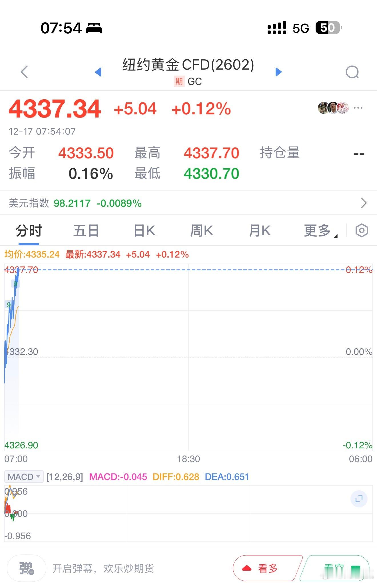 惊魂一夜!黄金上演“V”型反转周二(12月16日)纽约尾盘,现货黄金与COMEX黄金期货均跌0.03%,分别报4303.69美元/盎司、4333.70美元/盎司。当日黄金走势跌宕,一半时间低位震荡,亚太午盘刷日低至4271.92美元。不过,在美国非农就业报告发布前90分钟,黄金开始走高,数据发布后持续反弹,23:08刷日高至4335.11美元,日内交投区间较大。这一波行情,让投资者心跳加速,市场后续走向值得关注。金价 金价又涨了