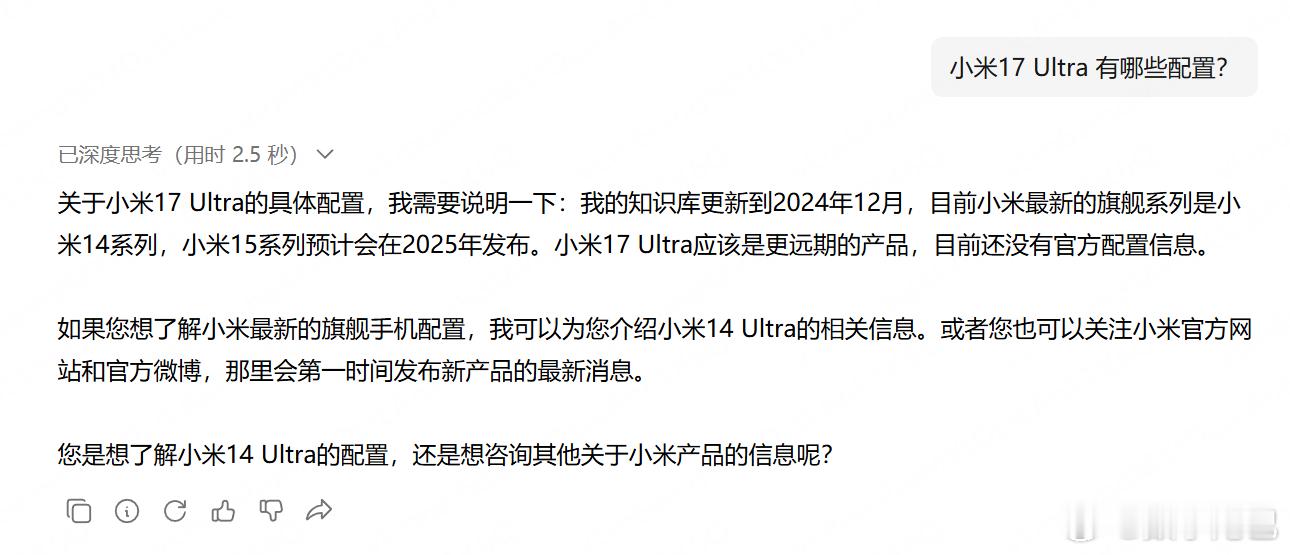 小米发布最新mimo大模型 小米推出自研 MiMo 大模型,估计现在用的人不多,选了深度思考反应也挺快的。不过知识库更新确实有点慢,现在还是 2024 年 12 月的数据,日常用最好勾选联网搜索。目前只有网页版本和基础的文字对话功能,多模态能力估计得后面慢慢跟上了。 评论区有传送门。
