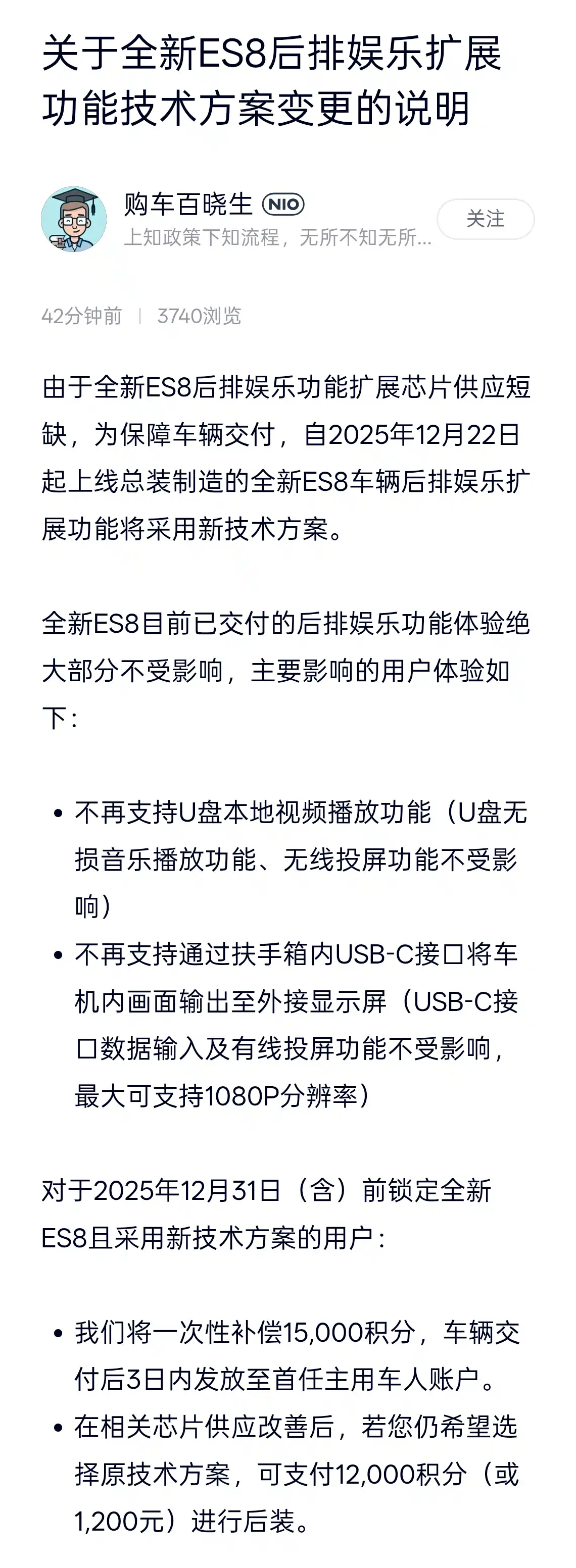 与此同时,对于2025年12月31日(含)前锁定全新ES8且采用新技术方案的用户:将一次性补偿15000积分,车辆交付后3日内发放至首任主用车人账户;在相关芯片供应改善后,若您仍希望选择原技术方案,可支付12,000积分(或1,200元)进行后装。