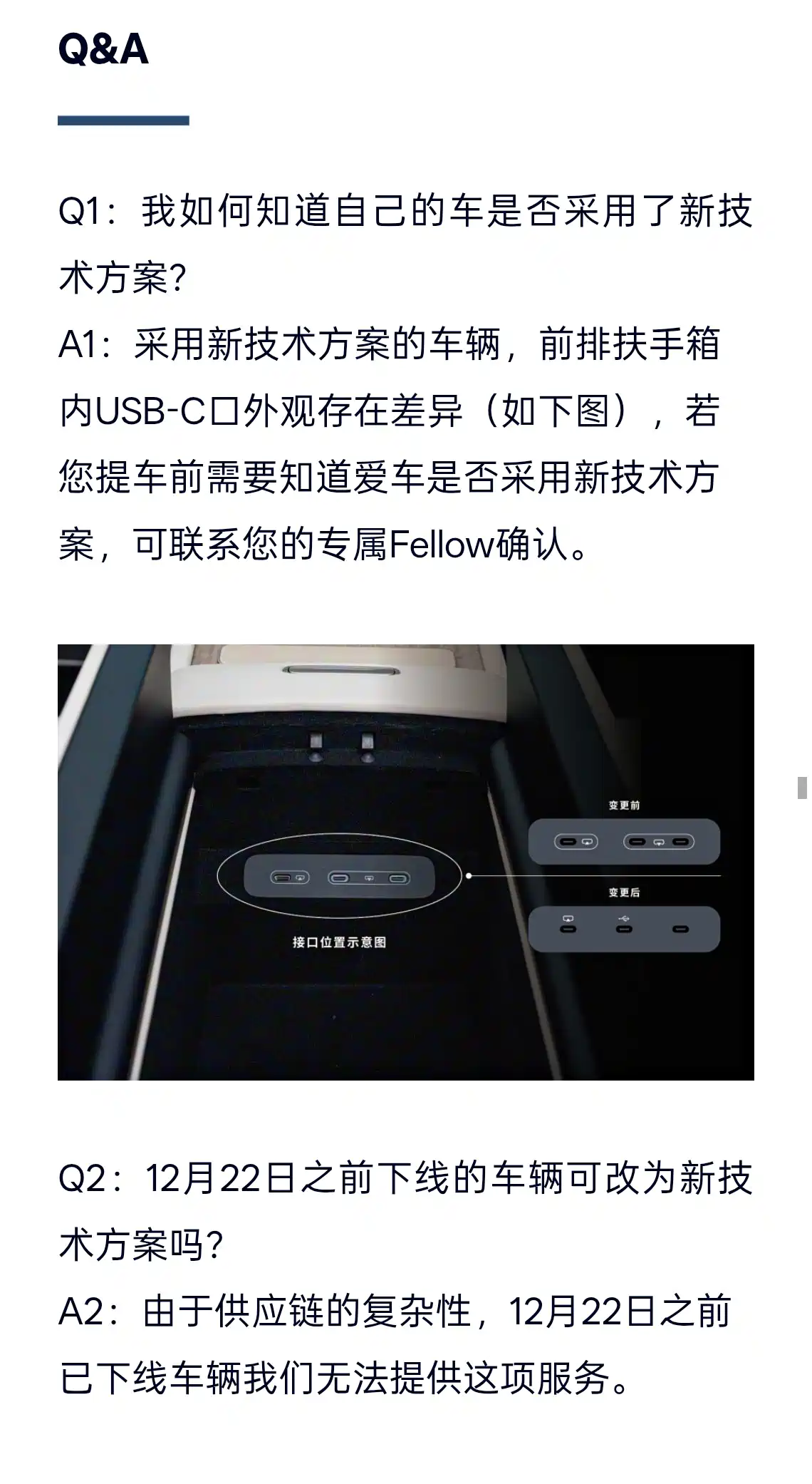 A2:采用新技术方案的车辆,前排扶手箱内USB-C口外观存在差异(如上图),若提车前需要知道是否采用新技术方案,可联系专属Fellow确认。
