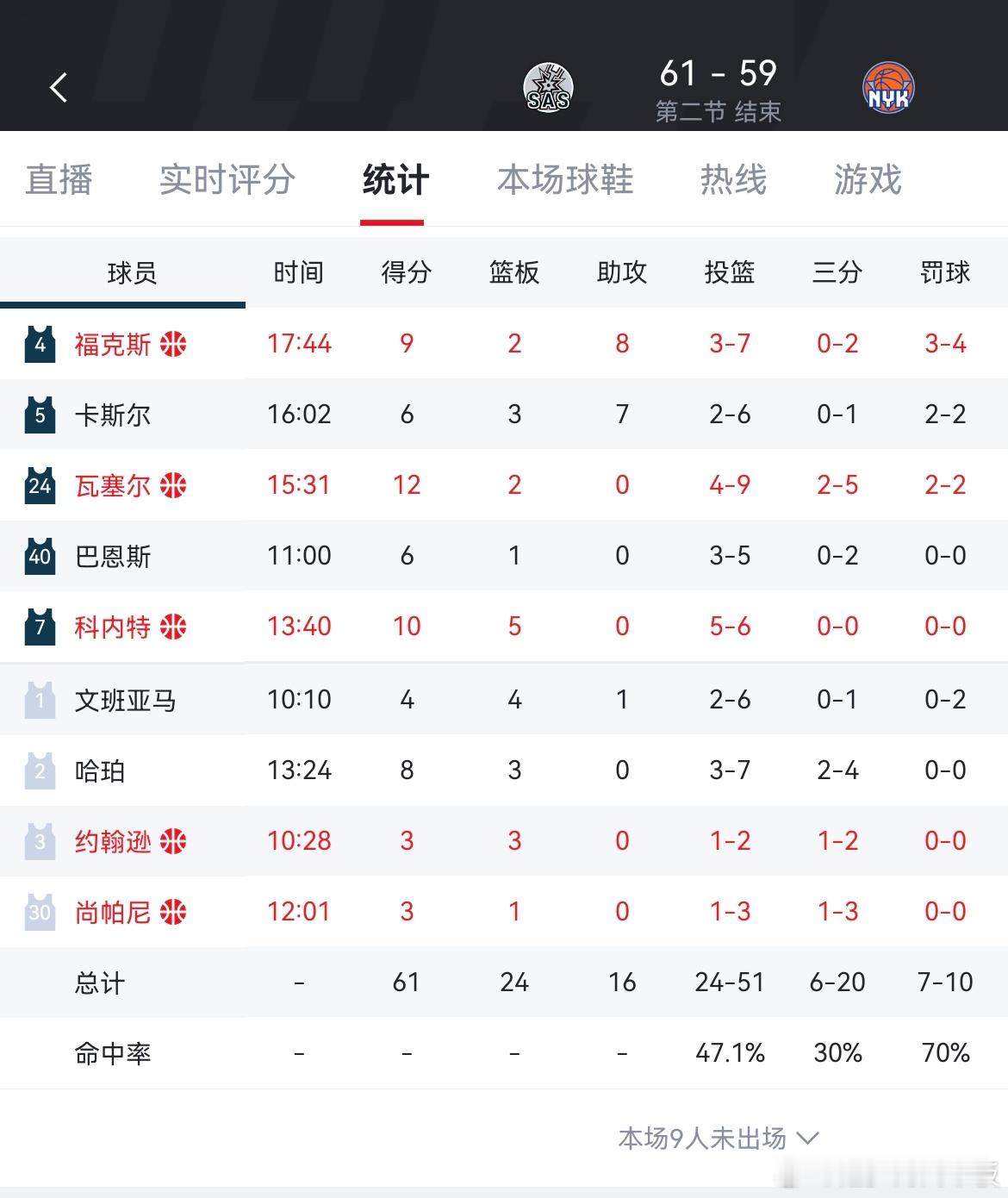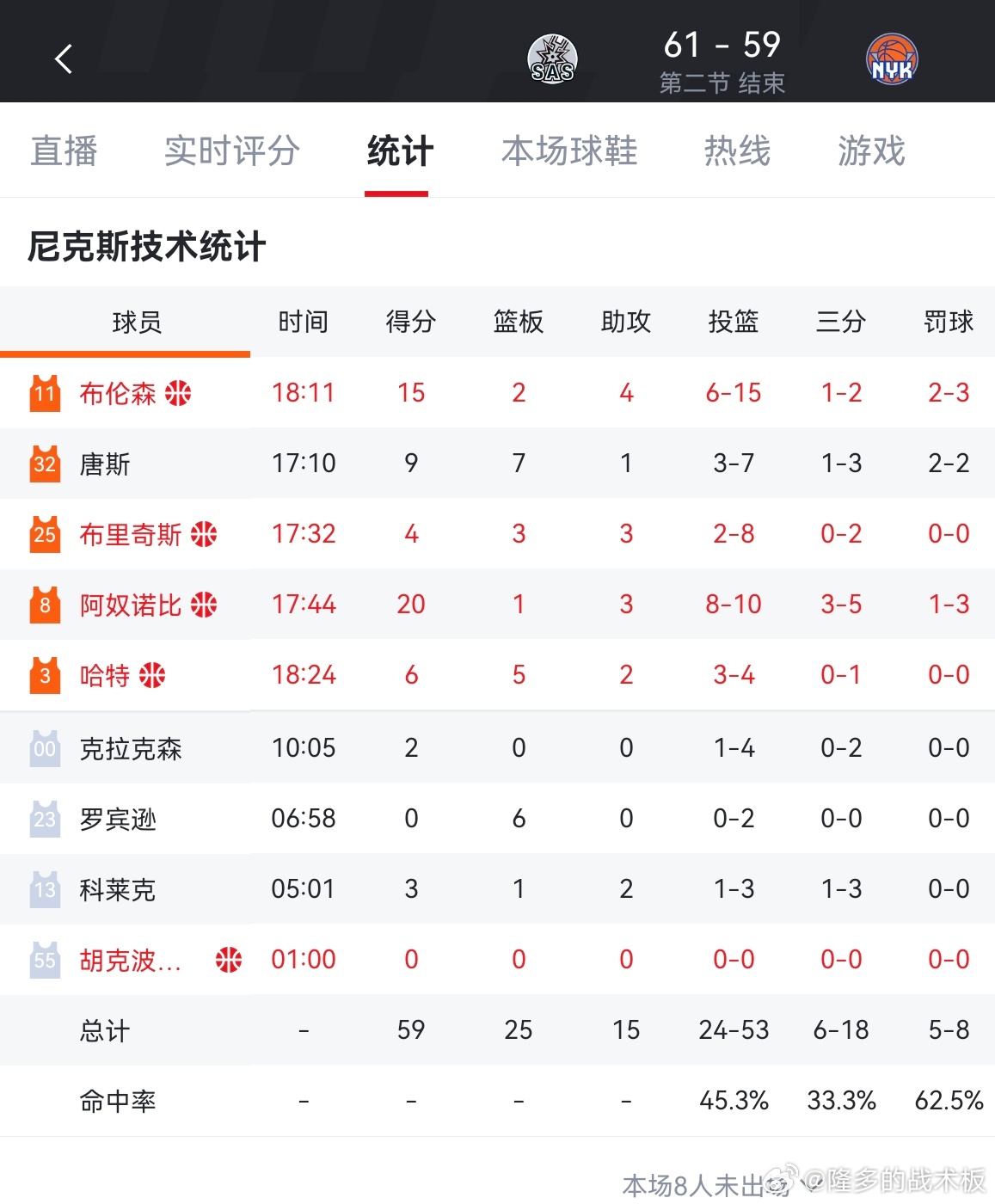 半场马刺61-59领先尼克斯!阿奴诺比10中8独砍20分马刺vs尼克斯