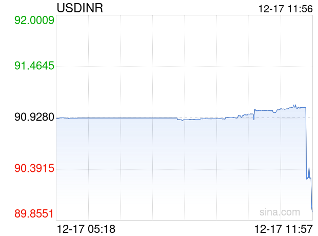 新浪外汇消息2025年12月17日,截至11时56分,外汇市场上美元兑印度卢比汇率跌破1美元兑换89.8750印度卢比。跌幅为-1.1581%