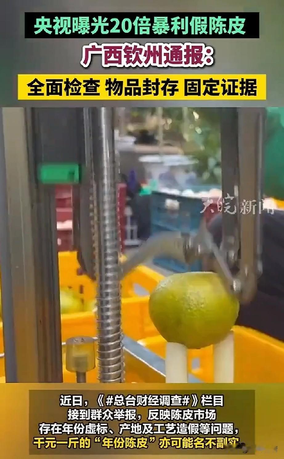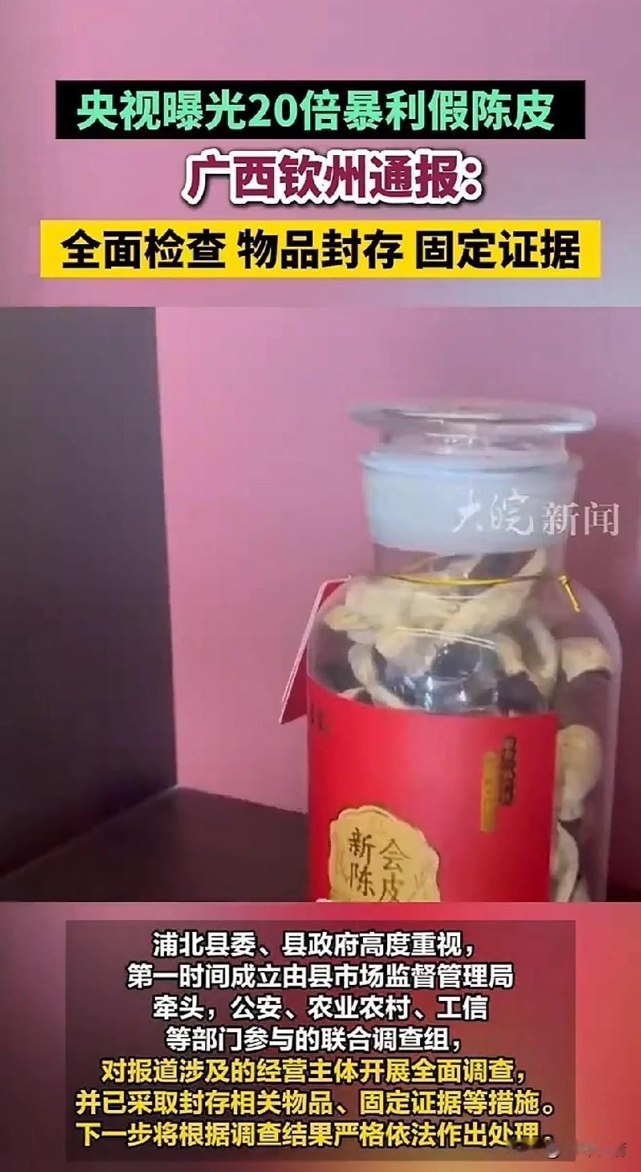 谁能想到广西钦州的新会陈皮居然有这么多假货,要不是央视曝光, 大多数人都被蒙在鼓里, 他们居然用新鲜的橘子皮, 通过烤干加工将其变为陈皮, 价格直接翻了20倍, 这样制作的陈皮, 基本没有什么药用价值, 可以说非常的假, 甚至数千元一斤的陈皮也是虚标年份, 基本上都是不合格的东西, 真的是为了利益无所不用其极, 灯下黑被造假企业玩的明明白白, 如今被爆出来之后, 当地也是非常重视, 还成立了联合调查组, 将证据固定封存, 进一步进行调查, 调查后将会直接做出处理, 可以说这次陈皮作假事件, 严重暴露了监管不足的漏洞, 这条巨大的利益链, 想必背后一定不简单, 大家对于这次陈皮造假被曝光怎么看? 广东陈皮 陈皮的分辨 红皮陈皮 江门市新会陈皮 陈皮的分辨方法 挑选陈皮 陈皮的辨别方法