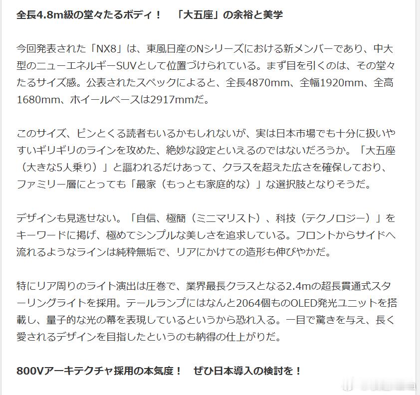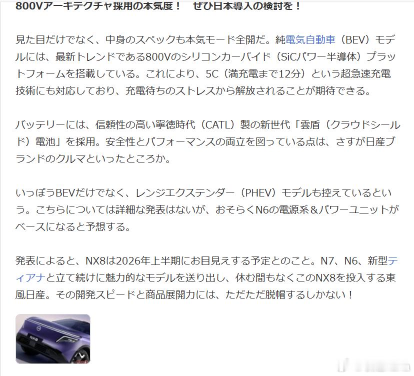 日本汽车媒体每天变着花样夸东风日产。标题直译:【东风日产推新车的速度真的逆天,N6+N7之后又来了个SUV,2026年会有纯电BEV和增程HEV两版本】主标题直译:【大五座的余裕和美学】【800V架构的认真程度!请考虑引入日本市场】日本汽车媒体没有说日产,而是强调了东风日产,他们知道这是中国团队整出来的狠活。上次,日本的汽车媒体也震惊于天籁的鸿蒙座舱,还专门试驾了一下,感受2.0T可变压缩比的澎湃动力,以及鸿蒙5座舱的先进智能体验。。我一直认为日本汽车媒体的水平和立场都是在线的,他们真的能感受出什么是好,好的东西不分国籍。上次看他们锐评广汽丰田铂智3X,哪怕他们知道这车跟广汽埃安有关系,依然保持了客观的评价,对很多新能源也是抱有开放包容的心态。只可惜,更广泛的普通人,民间,不这么想。评论区都是一片谩骂、嘲讽、质疑。大v聊车