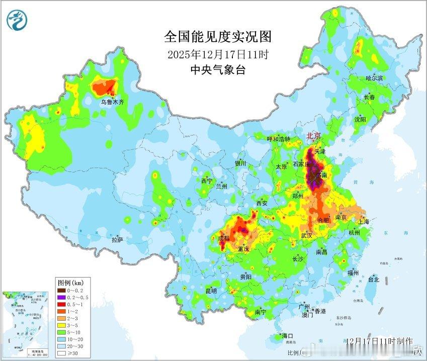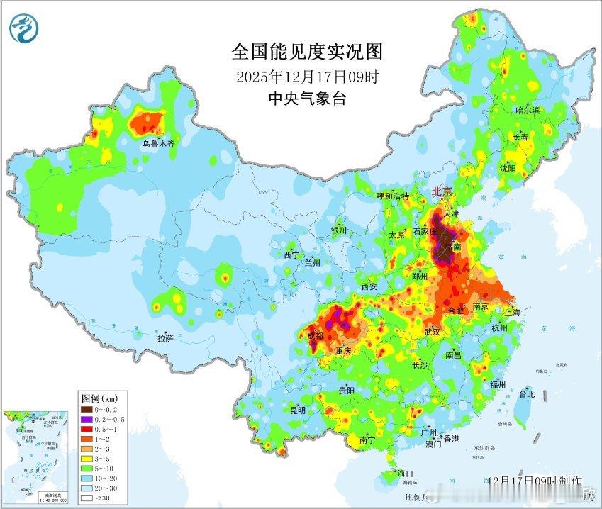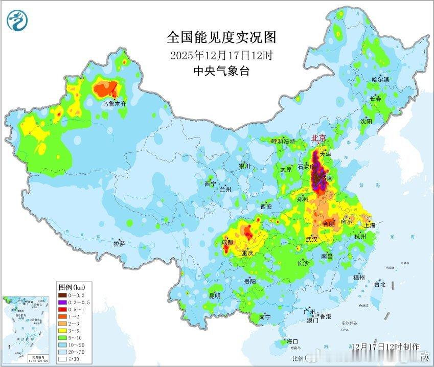 【雾和霾】从卫星监测看,从河北河南山东江苏安徽湖北等地,白色的为雾,灰色的为霾。结合能见度的监测,河北山东一带的雾到了中午12时还没有完全消散。12时部分站点能见度不足100米:河北临西56米、徐水83米、南宫98米、山东临清74米、齐河79米、禹城83米、茌平89米、聊城99米。