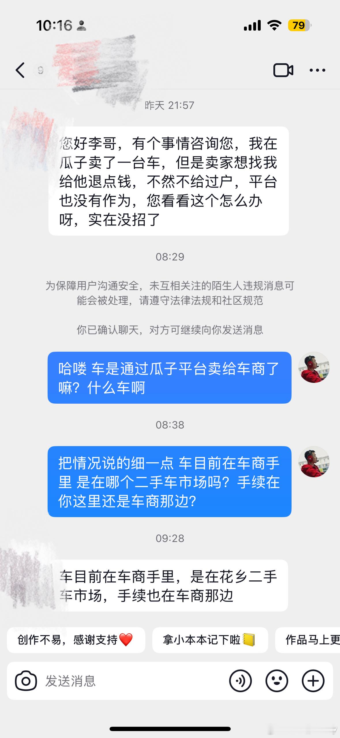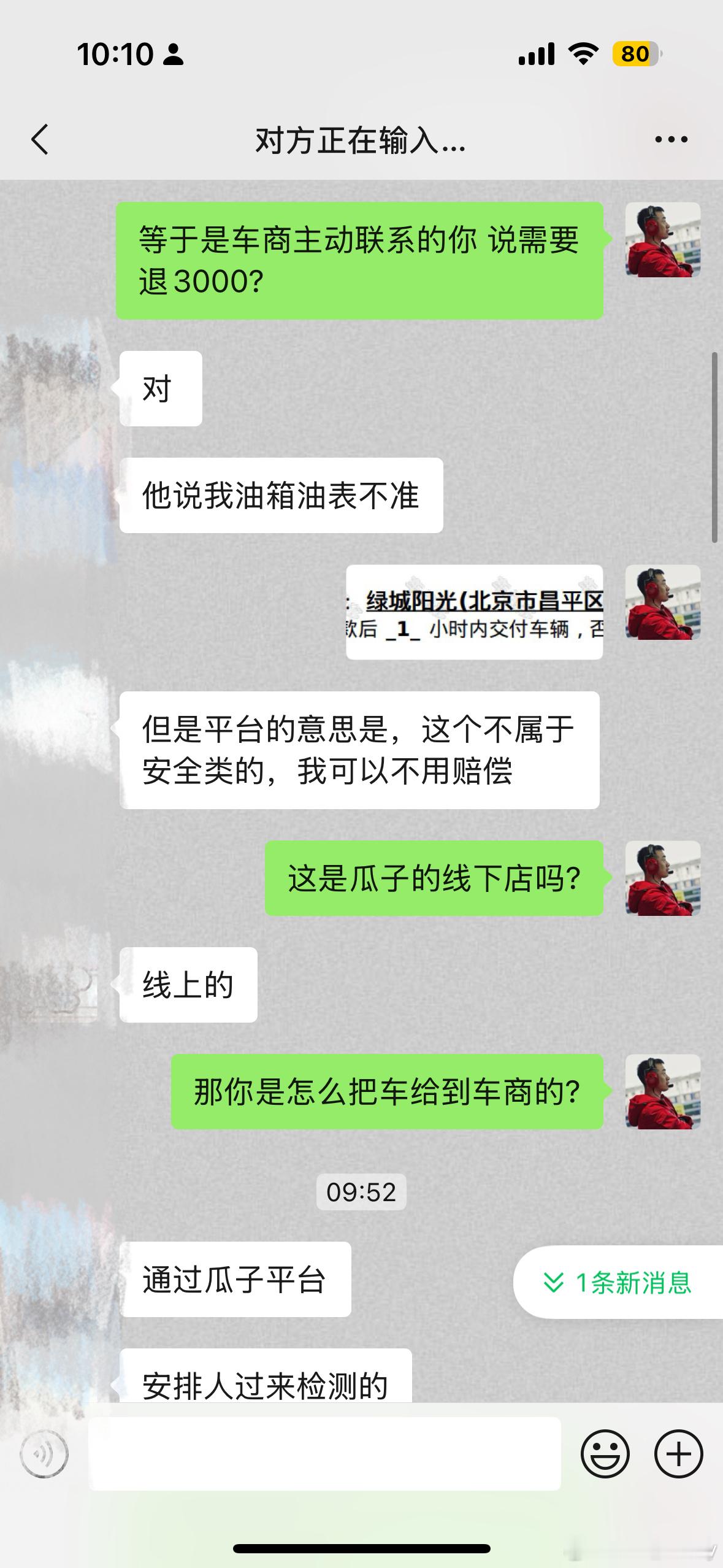 早上粉丝朋友私信遇到的问题…通过瓜子平台把自己的X1卖给了花乡市场车商 车款已收到…车商收到车以油量表不准要求退车款3000 不然不过户并发短信威胁…瓜子平台答复是车主可以不退还 并没有进一步解决问题…现在咱们都这么干事了嘛 真是闻所未闻…北京